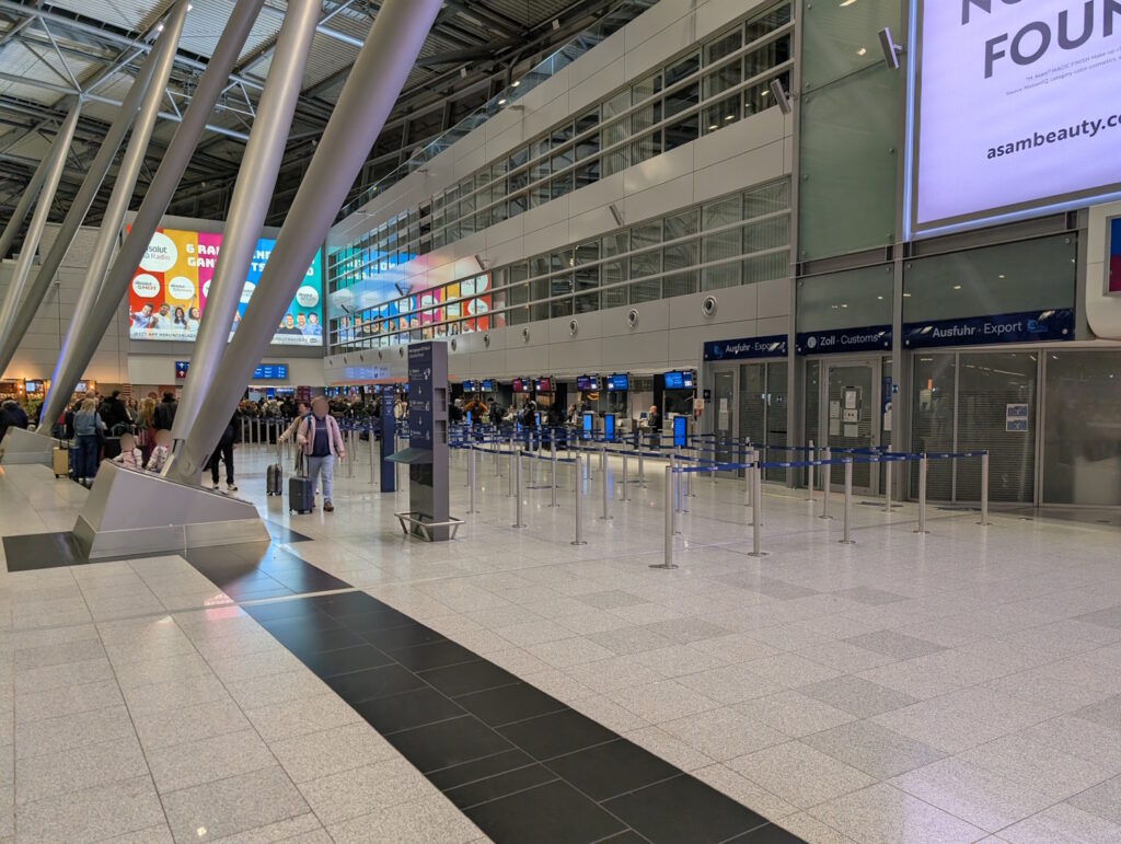 Am Flughafen Düsseldorf wurden die meisten klassischen Check-In-Schalter in den letzten Monaten zu Selbstbedienungs-Gepäckaufgabeautomaten umgebaut. Die Schalter, an denen British Airways eincheckt (Schalter 190+) waren davon aber an unserem Flugdatum noch nicht betroffen. Eingecheckt hatten wir, insbesondere aufgrund der Tatsache, dass Sitzplatzreservierungen bei BA auch in der Business Class kostenpflichtig sind (das gilt sogar bei einem Anschluss in der First Class, was ich irgendwie etwas schäbig finde) und wir deshalb darauf verzichtet hatten, bereits am Vortag online, wo uns die Plätze 1A und 1C zugelost worden waren. Dementsprechend mussten wir nur unsere zwei Gepäckstücke aufgeben und unsere Bordkarten drucken lassen, was ohne Wartezeiten innerhalb weniger Sekunden erledigt war.
