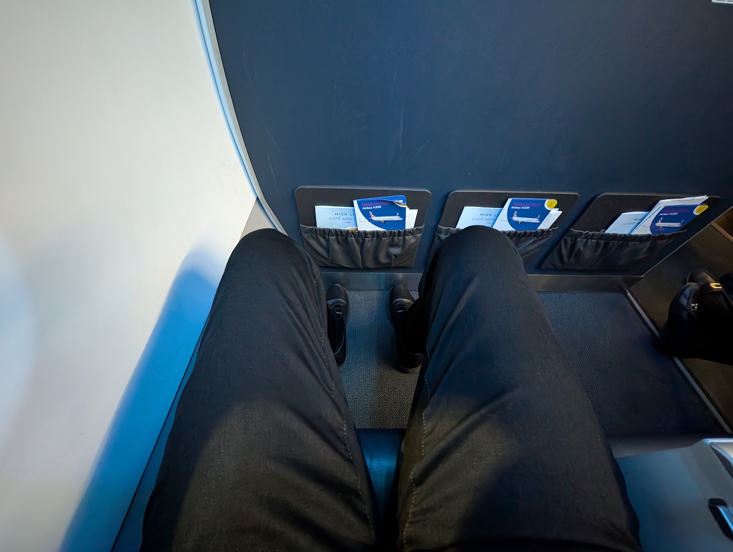 Ansonsten bewegt sich die Beinfreiheit insbesondere in der ersten Reihe auf üblichem Niveau, während der Sitzplatz 1C unter dem auf der A320-Familie üblichen Nachteil leidet, dass man beim Einsteigen mehr oder weniger mitten im Gang sitzt und häufig angerempelt wird.