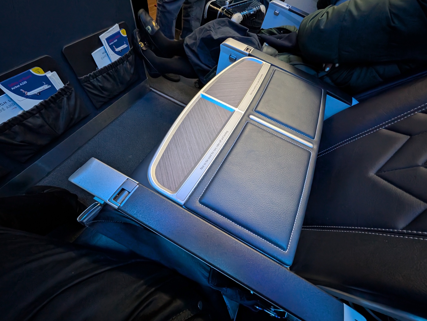 Einmal eingestiegen, erwartete uns das typische europäische Kurzstrecken-Produkt, das auch British Airways auf ihren Schmalrumpf-Flugzeugen anbietet; will meinen, Dreierreihen, in denen im mit einem Vorhang abgetrennten Business Class-Bereich der mittlere Sitzplatz nicht vergeben wird. Im Gegensatz zu den meisten anderen europäischen Carriern wird hier aber der Mittelplatz noch mit einem Tisch überbaut, der aber auch nur bedingt sinnvoll nutzbar ist.
