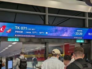 Gut eine Dreiviertelstunde vor unserem Abflug wurde dann auf der Anzeigetafel unser Flug mit einem Gate im Satellitengebäude B und dem Hinweis „Now Boarding“ angezeigt. Davon sollte man sich allerdings nicht verrückt machen bzw. hetzen lassen, es genügt, zur auf der Bordkarte angegebenen Einsteigezeit am Gate zu sein. Mit dieser Methode möchte man vermutlich vermeiden, dass die Gäste erst auf den allerletzten Drücker am Gate erscheinen.