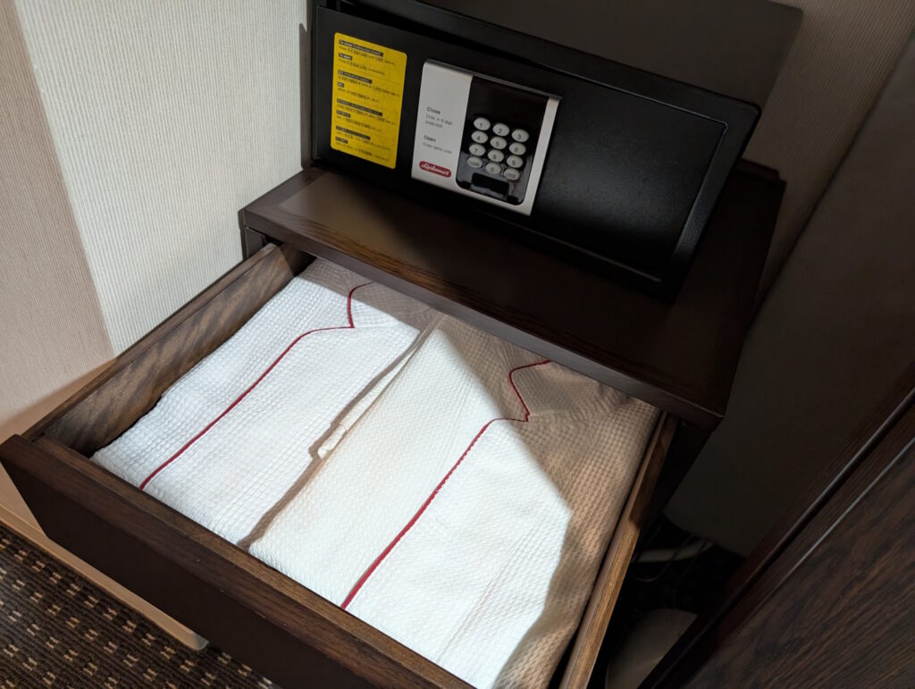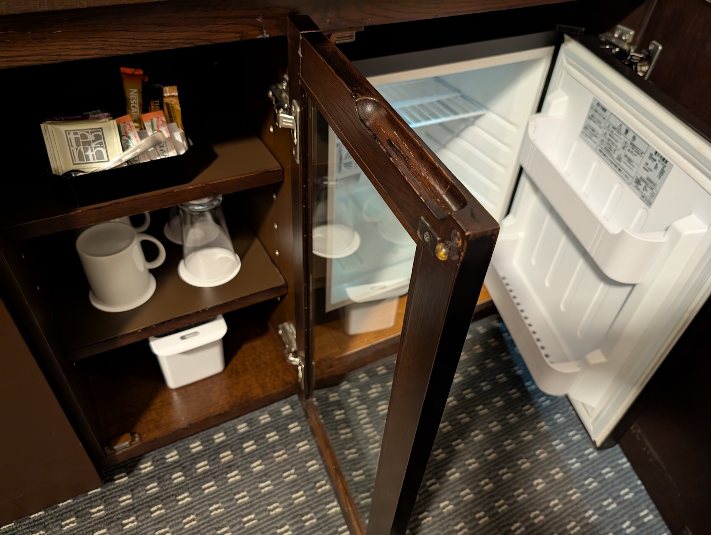 Grundsätzlich war das Zimmer zwar mit allem ausgestattet, was man grundsätzlich erwarten sollte, darunter zwei Bademäntel, einem leeren Minibarkühlschrank und einer Zubereitungsmöglichkeit für Tee und Instantkaffee, viele der gestalterischen Elemente des Raumes waren aber eher eine Beleidigung für das Auge und gehören dringend erneuert.