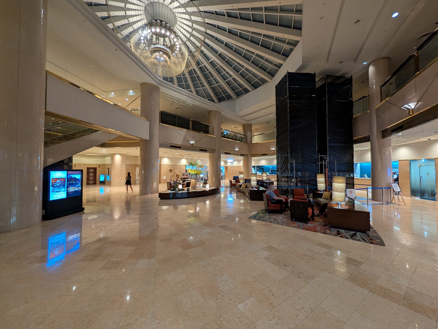 Beim Betreten der sehr geräumigen Lobby (die häufig von den hier nächtigenden Flugbesatzungen belegt war) zeigt sich aber schon die etwas in die Jahre gekommene Optik des Hotels. Hier ist man ganz eindeutig auf Massenabfertigung eingestellt, denn der (im Bild nicht wirklich sichtbare) Check-In-Bereich besteht aus einer ganzen Reihe von Schaltern im Airline-Stil, an der die Abfertigung dann für meine Begriffe unnötig lange dauerte.