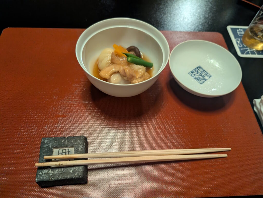 Da wir (für Onsen-Ryokans eher unüblich) nicht nur eine, sondern gleich zwei Nächte im Tosen Goshobo gebucht hatten, erhielten wir natürlich auch je zwei mal Abendessen und Frühstück. An unserem ersten Abend begann das Abendessen damit, dass die für uns zuständige Servicekraft an die Tür klopfte und uns mit einer englischsprachigen Menükarte sowie jeweils einem heißen Tuch („Oshibori“) ausstattete.