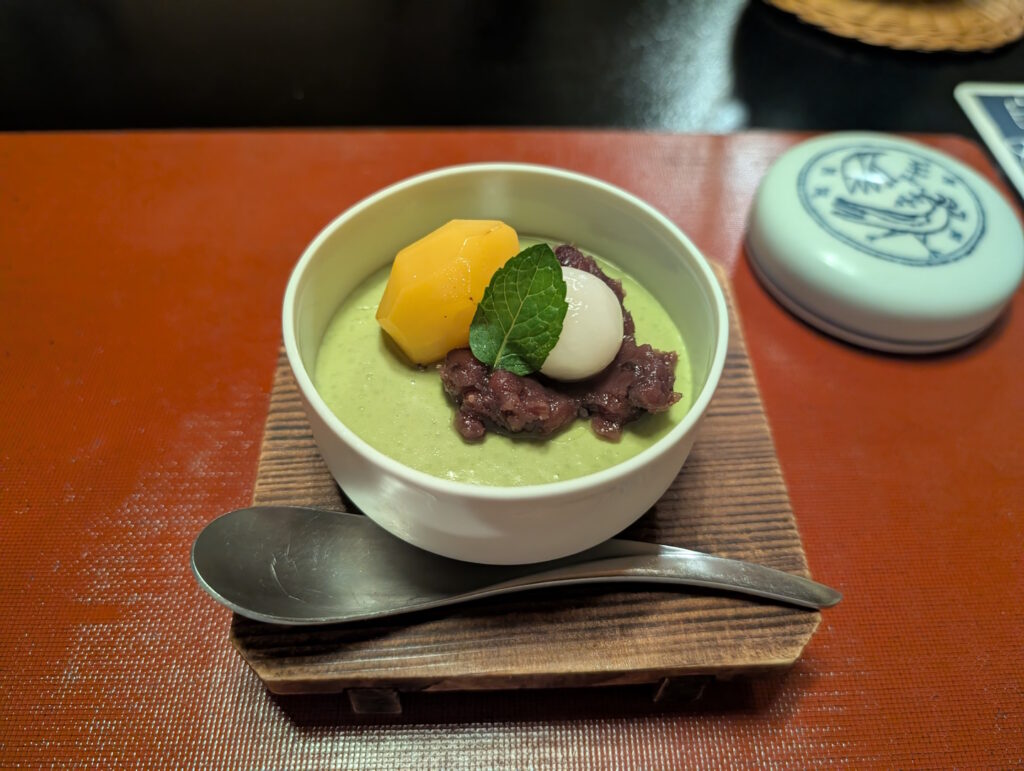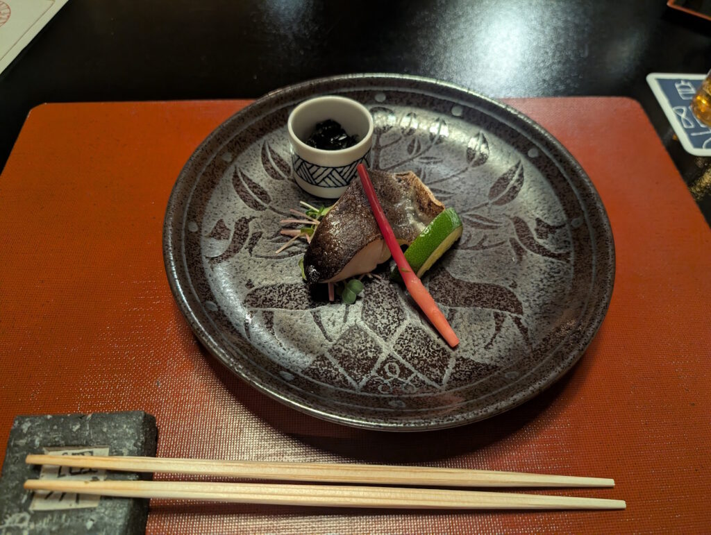 Jeder der servierten Gänge wurde ausführlich auf Japanisch (mit ein paar Bröckchen Englisch dazwischen) erläutert, bevor man (ebenfalls auf den Knien rutschend) das Zimmer wieder verließ und uns dem Essen überließ.