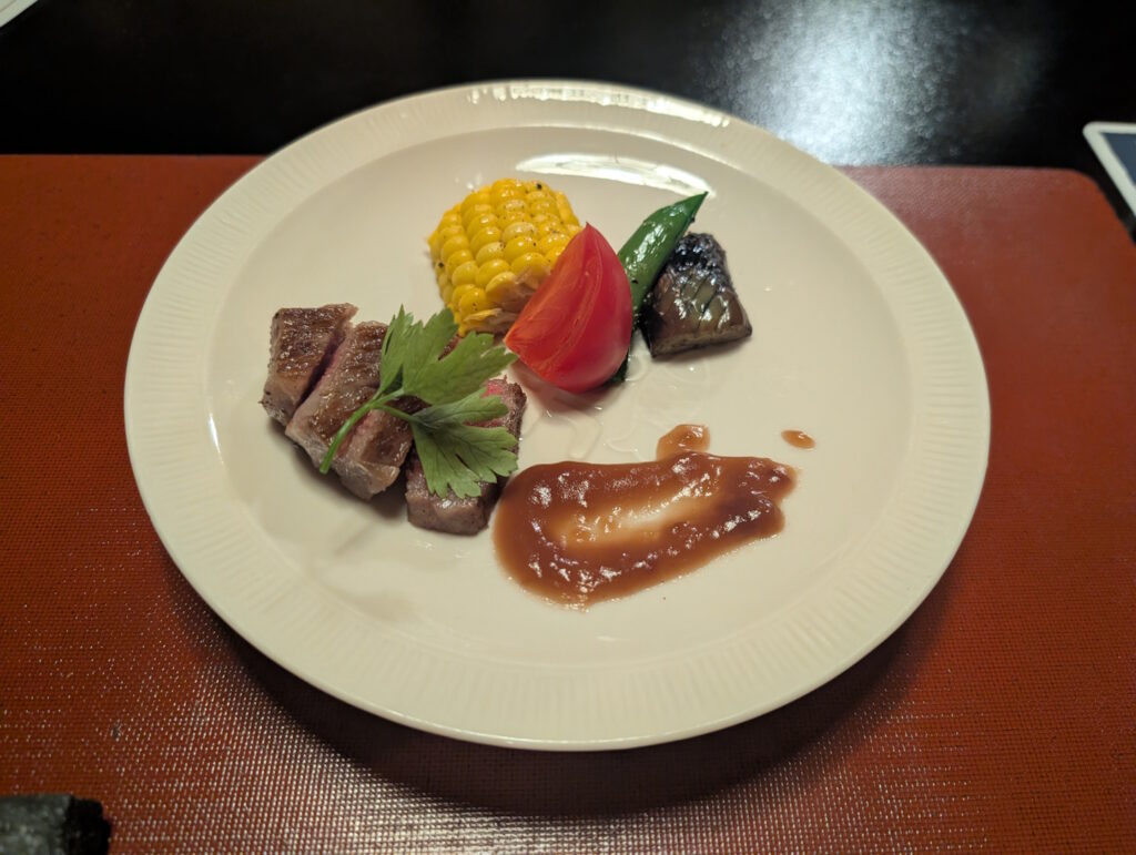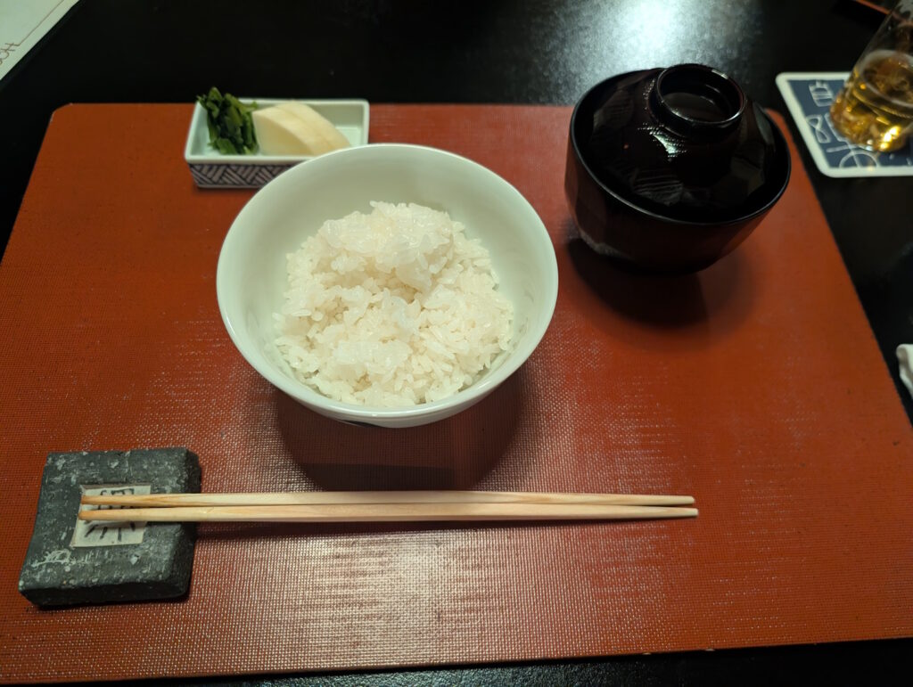 Das Essen war qualitativ ausgezeichnet und, in Summe gesehen auch überaus üppig (spätestens nach dem als Abschluss servierten Reis mit Miso-Suppe waren wir pappsatt). Auch dies ist in Ryokans durchaus die Regel, die hohe Qualität und die Quantität der servierten Speisen tragen zu einem nicht unerheblichen Teil zum gehobenen Übernachtungspreis bei.