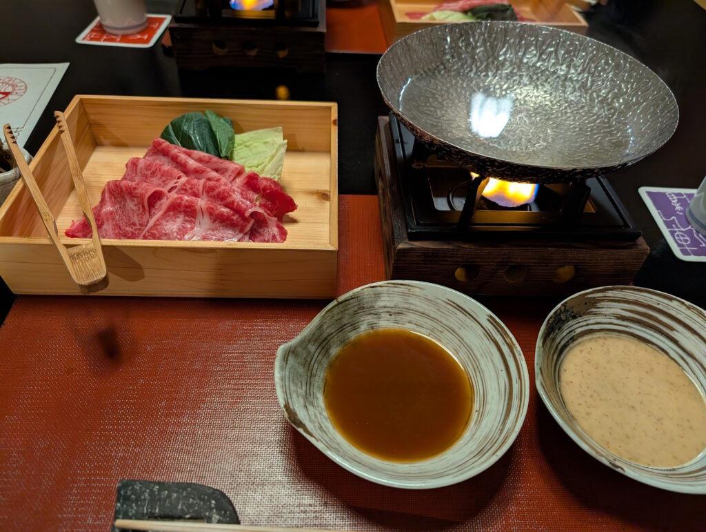 Ich habe darauf verzichtet, von jedem Gang ein separates Foto zu machen, dementsprechend findet ihr hier nur ein Bild vom eigentlichen Hauptgang, dem Shabu-Shabu, bei dem dünne Rindfleischstreifen in einer nur leicht gewürzten Suppe über offenem Feuer gegart werden.