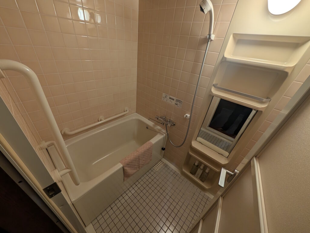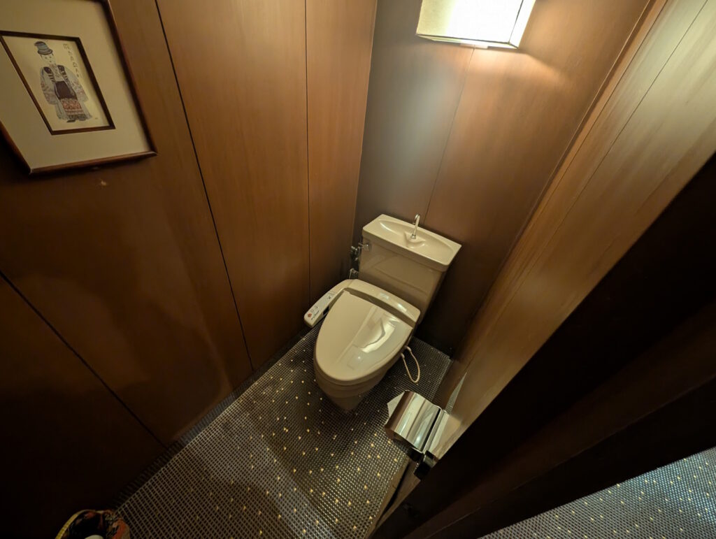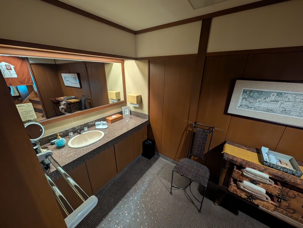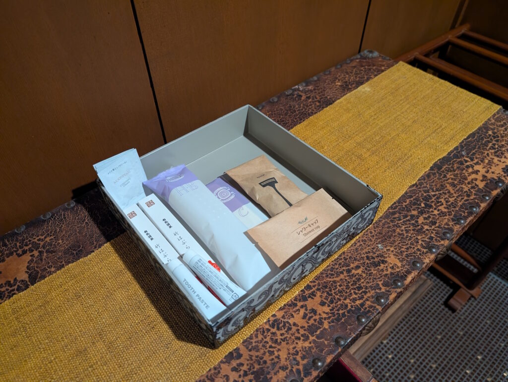 Ausgestattet war das Zimmer trotz seiner vergleichsweise ungewohnten Optik mit allen Annehmlichkeiten, die man auch von einem modernen westlichen Hotelzimmer erwarten kann: neben einem Telefon (in Bakelit-Retro-Optik) und jeweils einem Heiz- und Klimagerät pro Raum war auch das Badezimmer mit entsprechenden Kosmetika ausgestattet. Das hoteleigene WiFi war gut empfangbar (genutzt habe ich es dank eines internationalen Roaming-Plans aber nicht) und die Eingangstür zum Zimmer (ebenfalls Japan-typisch als Schiebetür ausgeführt) wurde durch einen vierstelligen Zahlencode aufgesperrt, der sinnvollerweise aus den vier letzten Ziffern der Mobilrufnummer des Zimmergasts bestand. Etwas schwierig zu bedienen waren hingegen die zwei Heiz- und Klimageräte, von denen sich je eines in jedem Raum befand – hierüber gibt es auch auf den öffentlichen Bewertungsplattformen einige Reklamationen. Zum Glück ließ das Wetter während unseres Aufenthalts es zu, weder heizen noch kühlen zu müssen.