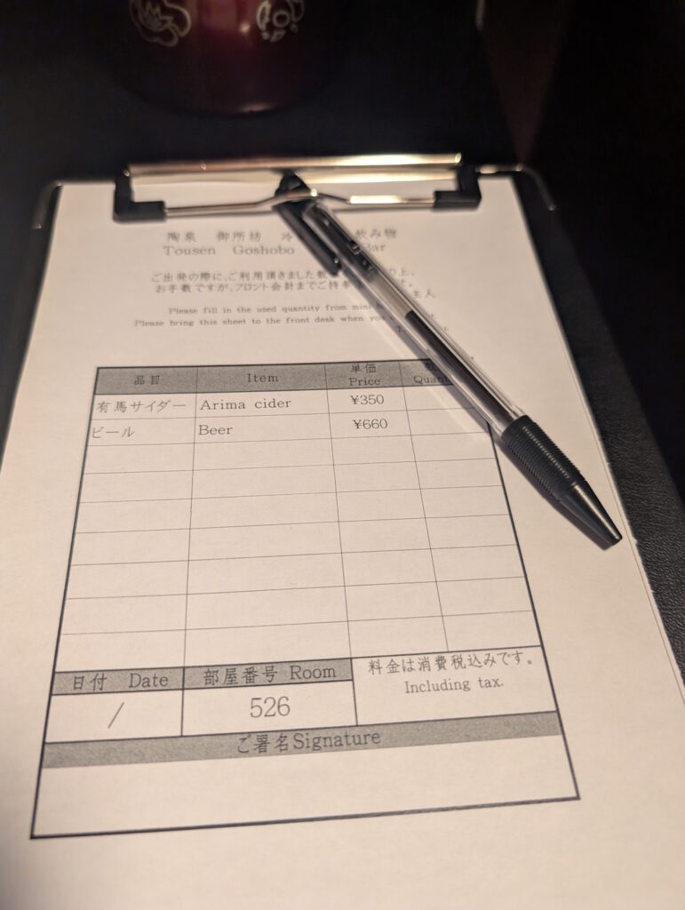 In der Minibar des Hotels, die im Sideboard des Nebenraums untergebracht war, fanden wir neben zwei im Preis inkludierten Wasserflaschen und einer kostenfreien Zubereitungsmöglichkeit für Tee (mehrere Sorten) auch eine kleine Auswahl an Bier und aromatisiertem Shochu. Die alkoholischen Getränke bewegten sich dabei preislich auf einem äußerst fairen Niveau, will meinen, man hätte hier nicht mehr bezahlt als auch beim Besuch eines Izakaya.