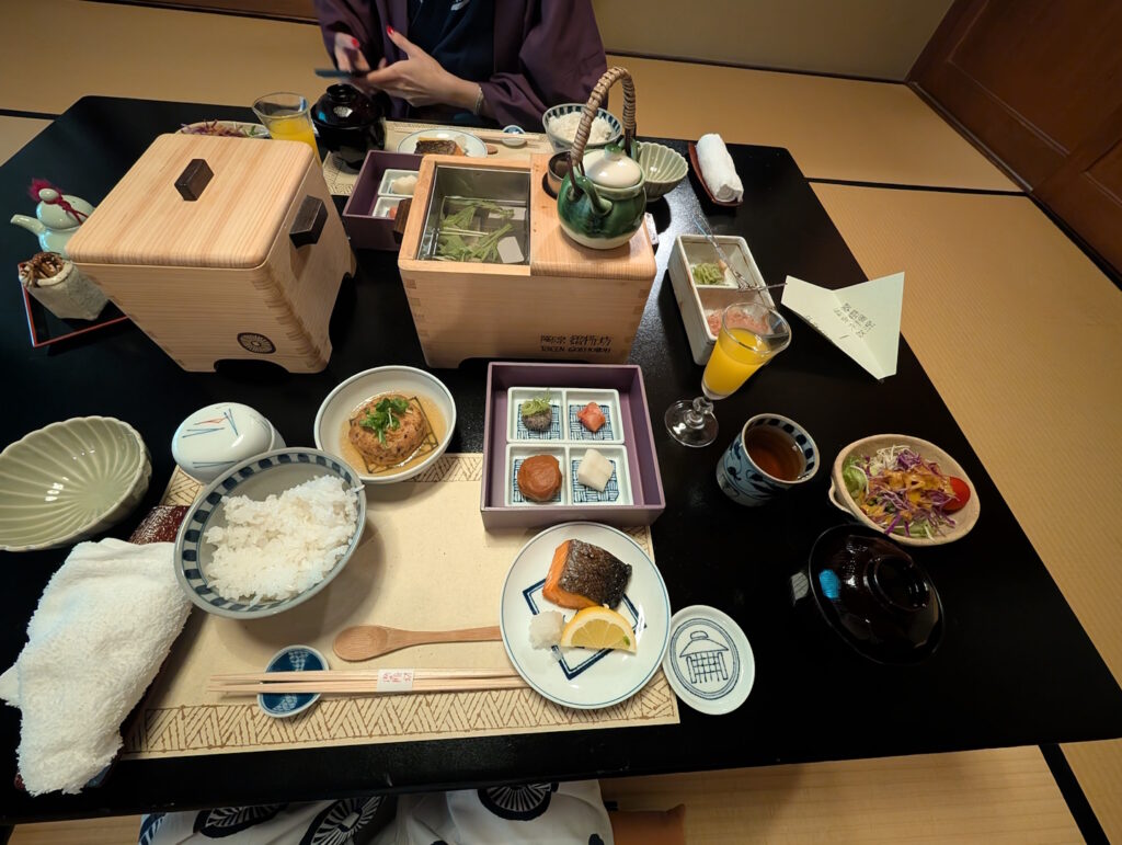 Da es sich um ein Onsen-Ryokan handelt, gibt es auf den Zimmern auch die traditionell in solchen Herbergen getragenen Yukatas, historisch aus einer deutlich einfacheren und vor allem günstigeren Variante des Kimono hervorgegangen. Diese Gewänder erinnern entfernt an ein Zwischending zwischen Nachthemd und Bademantel und werden in aller Regel mit einer dazugehörigen Jacke getragen. Nicht wundern sollte man sich, wenn man sich auch draußen auf der Straße mit Zeitgenossen konfrontiert sieht, die solcherlei Kleidung in der Öffentlichkeit tragen – dies ist nicht nur vollkommen akzeptiert, sondern durchaus üblich.