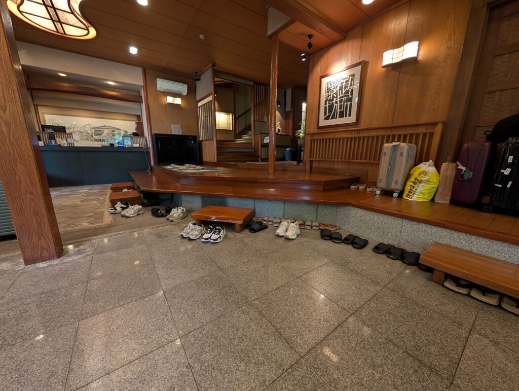 Nach Abschluss des Check In-Prozederes wurde uns zunächst unser Gepäck abgenommen und wir wurden gebeten, einer Mitarbeiterin zu folgen. Wie auch in japanischen Privatwohnungen ist es in Ryokans unbedingt üblich, nicht mit Straßenschuhen in die Wohnbereiche zu latschen; zu diesem Zwecke steht in der Lobby eine große Anzahl von Hausschlappen in allen möglichen Größen bereit, die man vor überschreiten der typischen Schwelle („Genkan“) anzieht. Die Straßenschuhe werden sodann an der Rezeption in Verwahrung genommen.