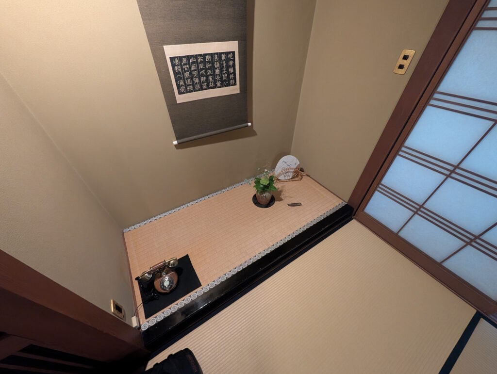 Das Zimmer, das nach internationalem Standard die Bezeichnung „Suite“ verdient gehabt hätte, bestand aus dem mit Tatami-Matten ausgelegten Hauptraum, der mit einem niedrigen Tisch ausgestattet als Speisezimmer und später, bei weggeräumtem Tisch und mit ausgelegten Futon-Matratzen auch als Schlafzimmer dient. Am Rande dieses Raumes befand sich ein mit zwei Stühlen, einem Bistrotisch und einem historischen Schreibtisch möblierter Erker, der auf den vorbeifließenden Bach und die Hauptstraße (auf der in der Nacht mehrfach einige sehr lautstark knatternde Mopeds unterwegs waren) blickte. Auch diese Raumausstattung ist in Ryokans durchaus die Regel.