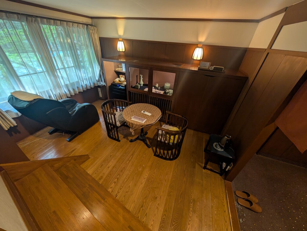 Vom Hauptraum mit verschiebbaren Papierwänden abgetrennt befand sich einige Treppenstufen tiefer ein weiterer Raum, der eher klassisch europäisch möbliert war. Hier findet man neben zwei weiteren Sitzgelegenheiten mit Tisch ein Sideboard mit Vitrine, in der nicht nur die Minibar mit Kühlschrank und Teezubereitungs-Möglichkeit untergebracht war, sondern in dem auch diverse antike Keramik ausgestellt wird. Highlight dieses Raums ist aber vermutlich eher der automatische Massagesessel, den wir während unseres Aufenthalts eingehend genutzt haben.
