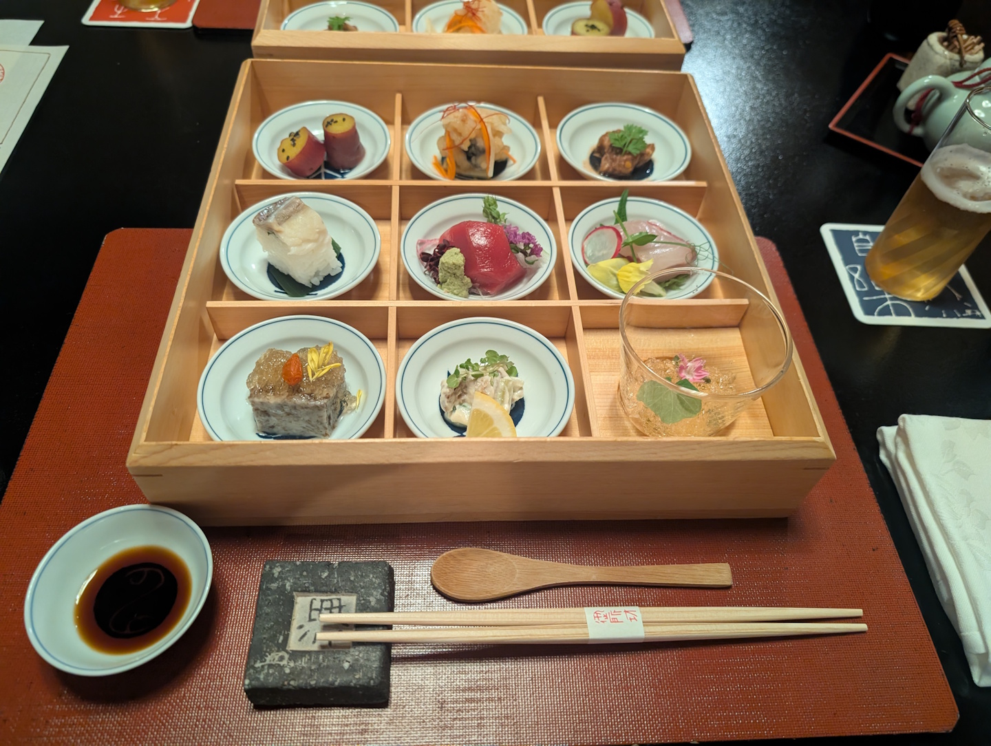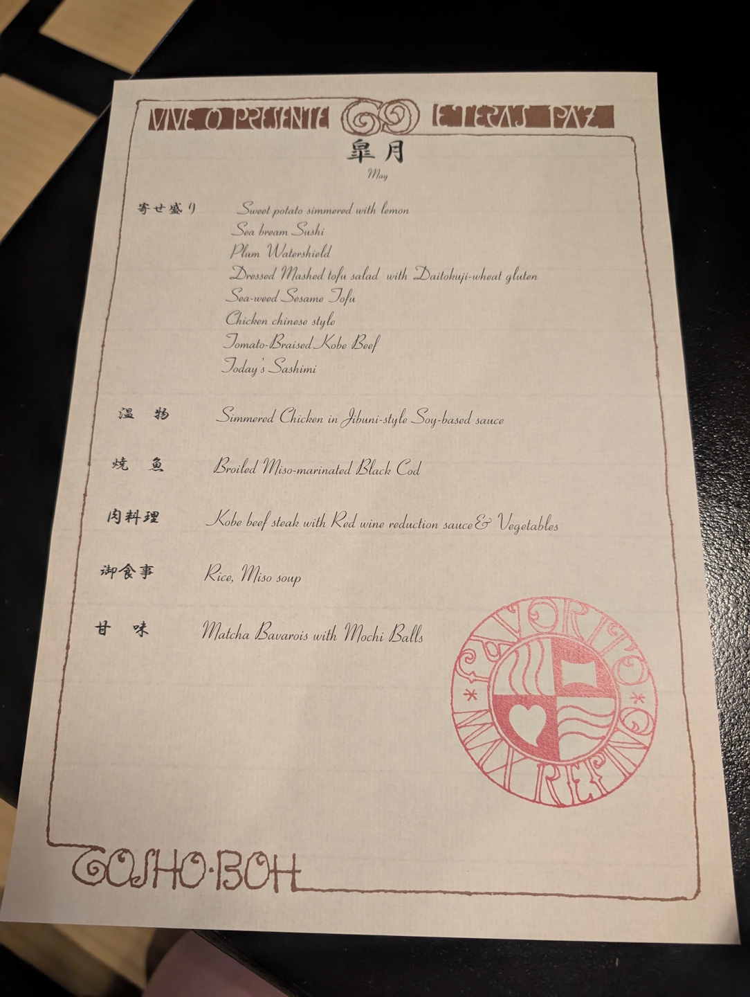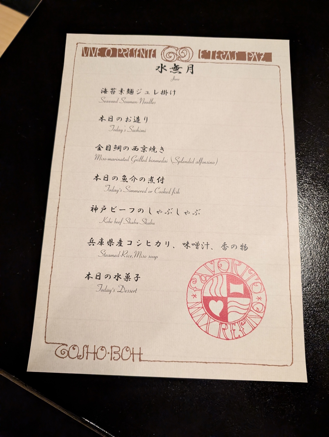 Da wir (für Onsen-Ryokans eher unüblich) nicht nur eine, sondern gleich zwei Nächte im Tosen Goshobo gebucht hatten, erhielten wir natürlich auch je zwei mal Abendessen und Frühstück. An unserem ersten Abend begann das Abendessen damit, dass die für uns zuständige Servicekraft an die Tür klopfte und uns mit einer englischsprachigen Menükarte sowie jeweils einem heißen Tuch („Oshibori“) ausstattete.
