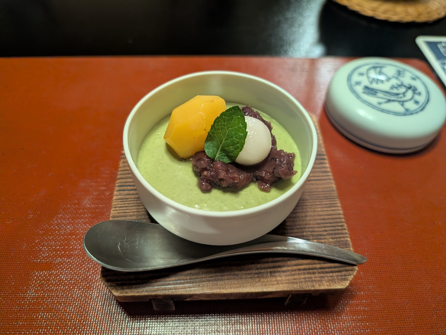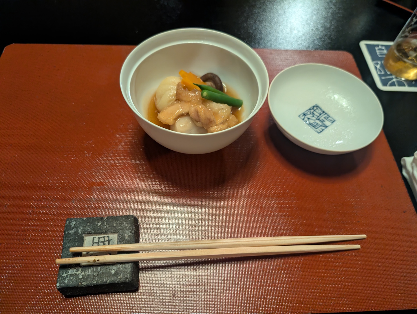 Das Frühstück hingegen wurde komplett in einem Gang serviert, neben einer warmen Komponente (in diesem Falle Seidentofu, der in einem Wasserbad warm gehalten wurde) gab es auch mehrere kalte Komponenten, dazu ebenfalls wieder Tee und ein kleines Glas Orangensaft.