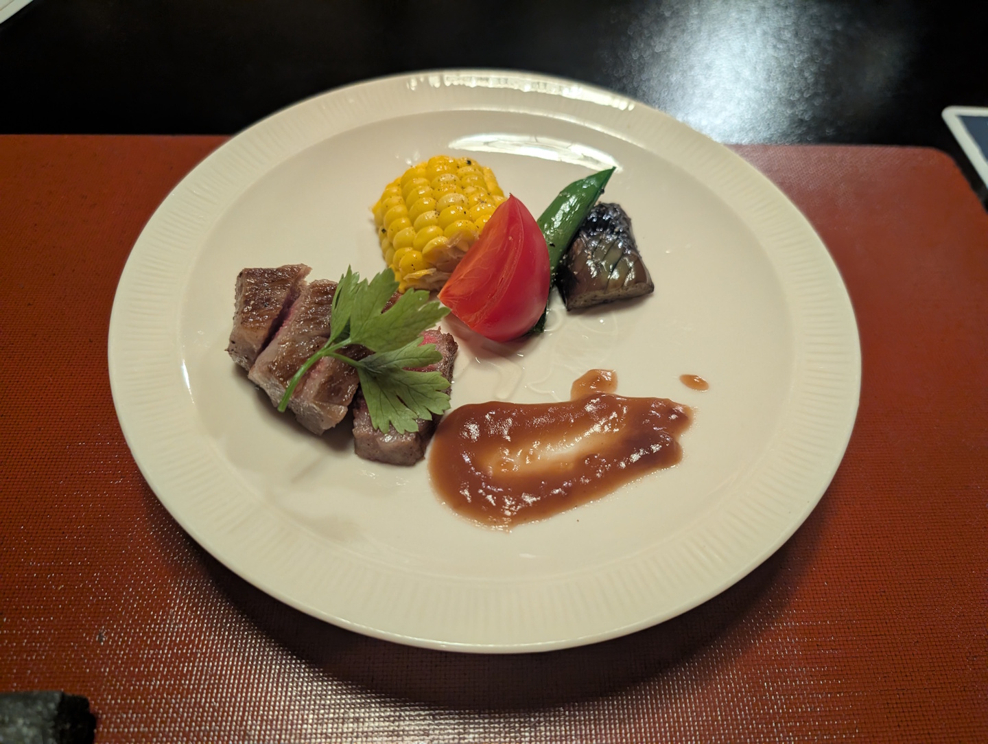 Ich habe darauf verzichtet, von jedem Gang ein separates Foto zu machen, dementsprechend findet ihr hier nur ein Bild vom eigentlichen Hauptgang, dem Shabu-Shabu, bei dem dünne Rindfleischstreifen in einer nur leicht gewürzten Suppe über offenem Feuer gegart werden.