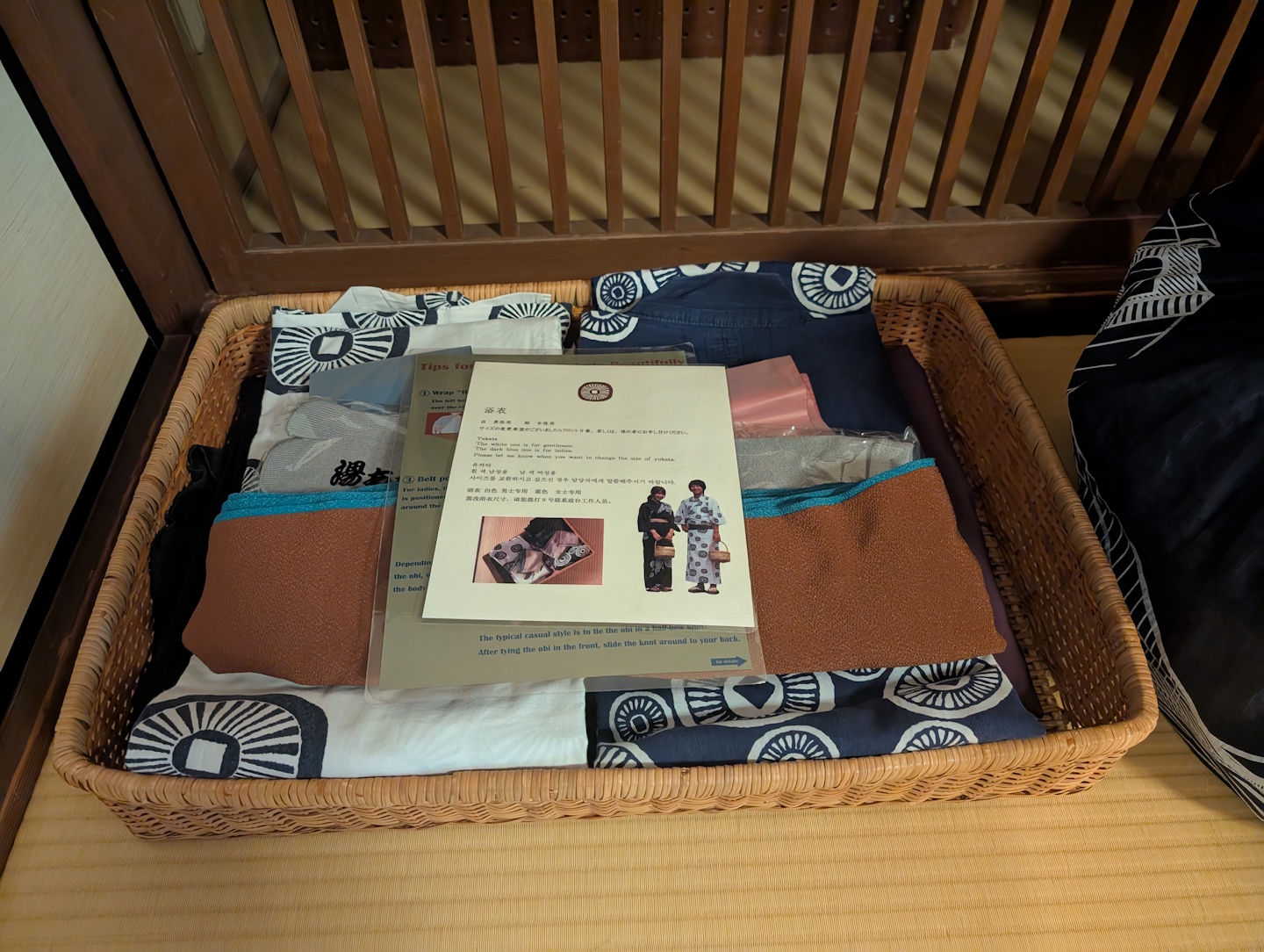 Da es sich um ein Onsen-Ryokan handelt, gibt es auf den Zimmern auch die traditionell in solchen Herbergen getragenen Yukatas, historisch aus einer deutlich einfacheren und vor allem günstigeren Variante des Kimono hervorgegangen. Diese Gewänder erinnern entfernt an ein Zwischending zwischen Nachthemd und Bademantel und werden in aller Regel mit einer dazugehörigen Jacke getragen. Nicht wundern sollte man sich, wenn man sich auch draußen auf der Straße mit Zeitgenossen konfrontiert sieht, die solcherlei Kleidung in der Öffentlichkeit tragen – dies ist nicht nur vollkommen akzeptiert, sondern durchaus üblich.