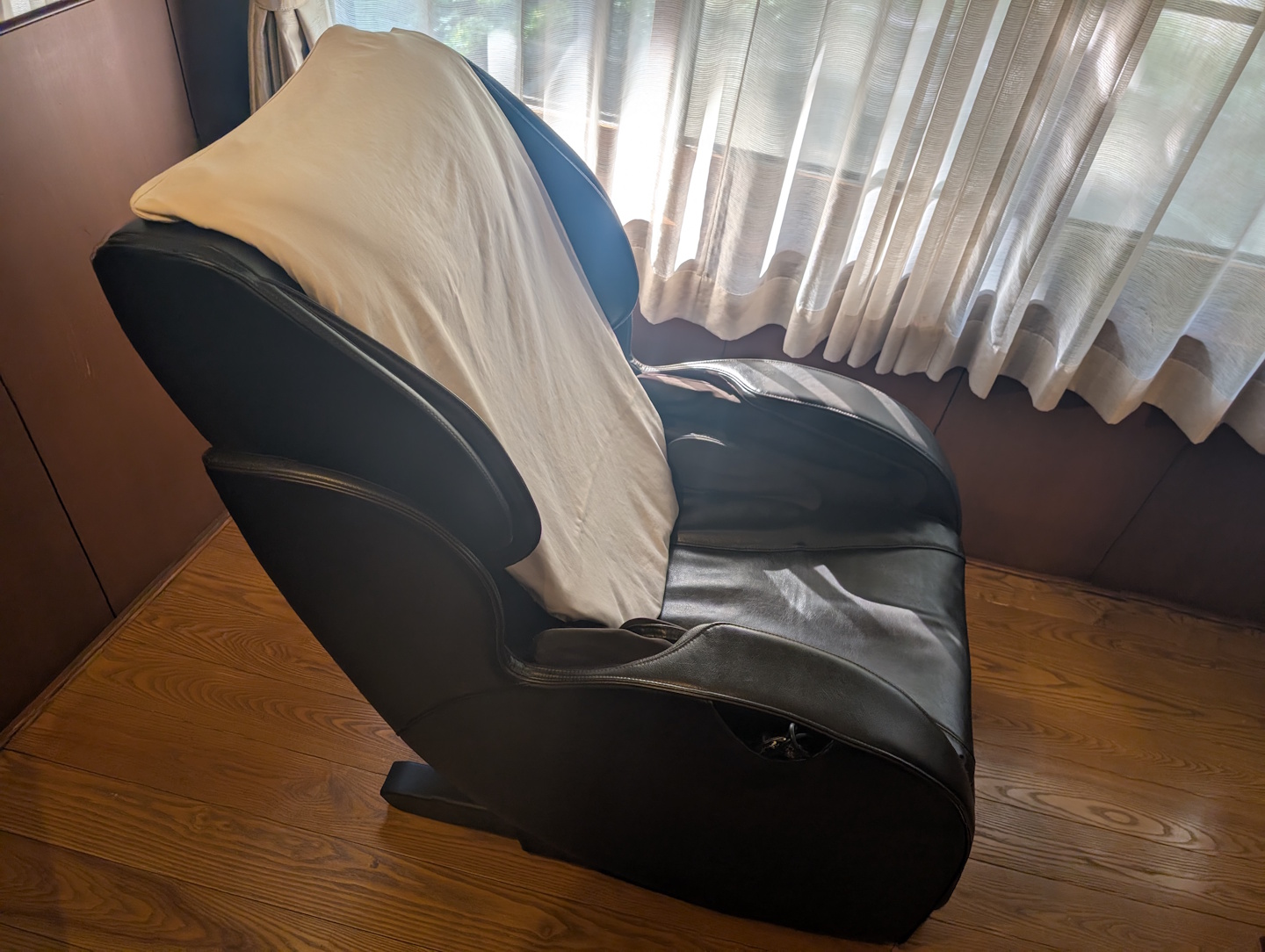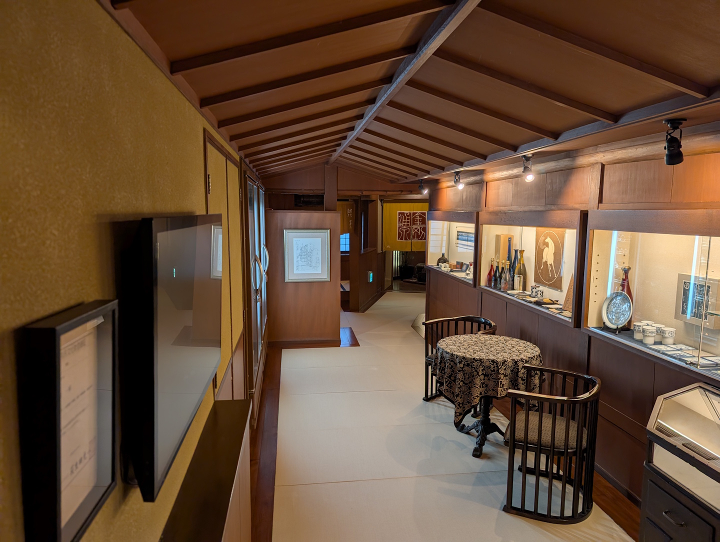 Vom Hauptraum mit verschiebbaren Papierwänden abgetrennt befand sich einige Treppenstufen tiefer ein weiterer Raum, der eher klassisch europäisch möbliert war. Hier findet man neben zwei weiteren Sitzgelegenheiten mit Tisch ein Sideboard mit Vitrine, in der nicht nur die Minibar mit Kühlschrank und Teezubereitungs-Möglichkeit untergebracht war, sondern in dem auch diverse antike Keramik ausgestellt wird. Highlight dieses Raums ist aber vermutlich eher der automatische Massagesessel, den wir während unseres Aufenthalts eingehend genutzt haben.