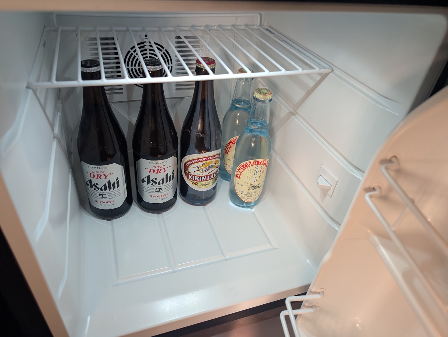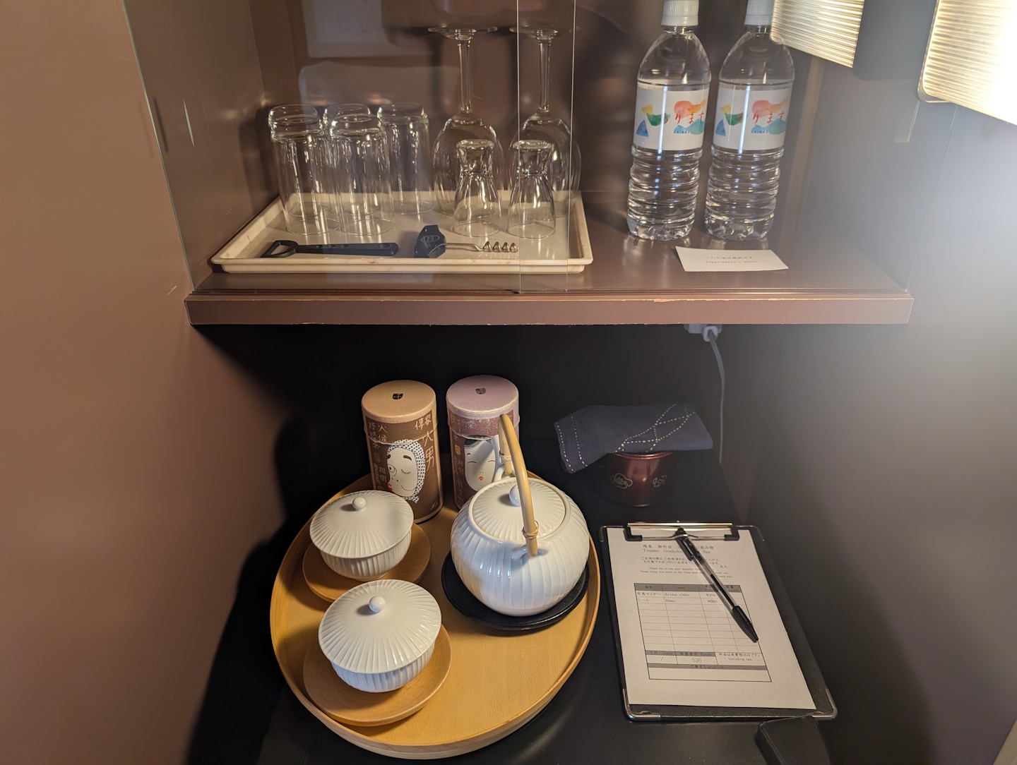 In der Minibar des Hotels, die im Sideboard des Nebenraums untergebracht war, fanden wir neben zwei im Preis inkludierten Wasserflaschen und einer kostenfreien Zubereitungsmöglichkeit für Tee (mehrere Sorten) auch eine kleine Auswahl an Bier und aromatisiertem Shochu. Die alkoholischen Getränke bewegten sich dabei preislich auf einem äußerst fairen Niveau, will meinen, man hätte hier nicht mehr bezahlt als auch beim Besuch eines Izakaya.