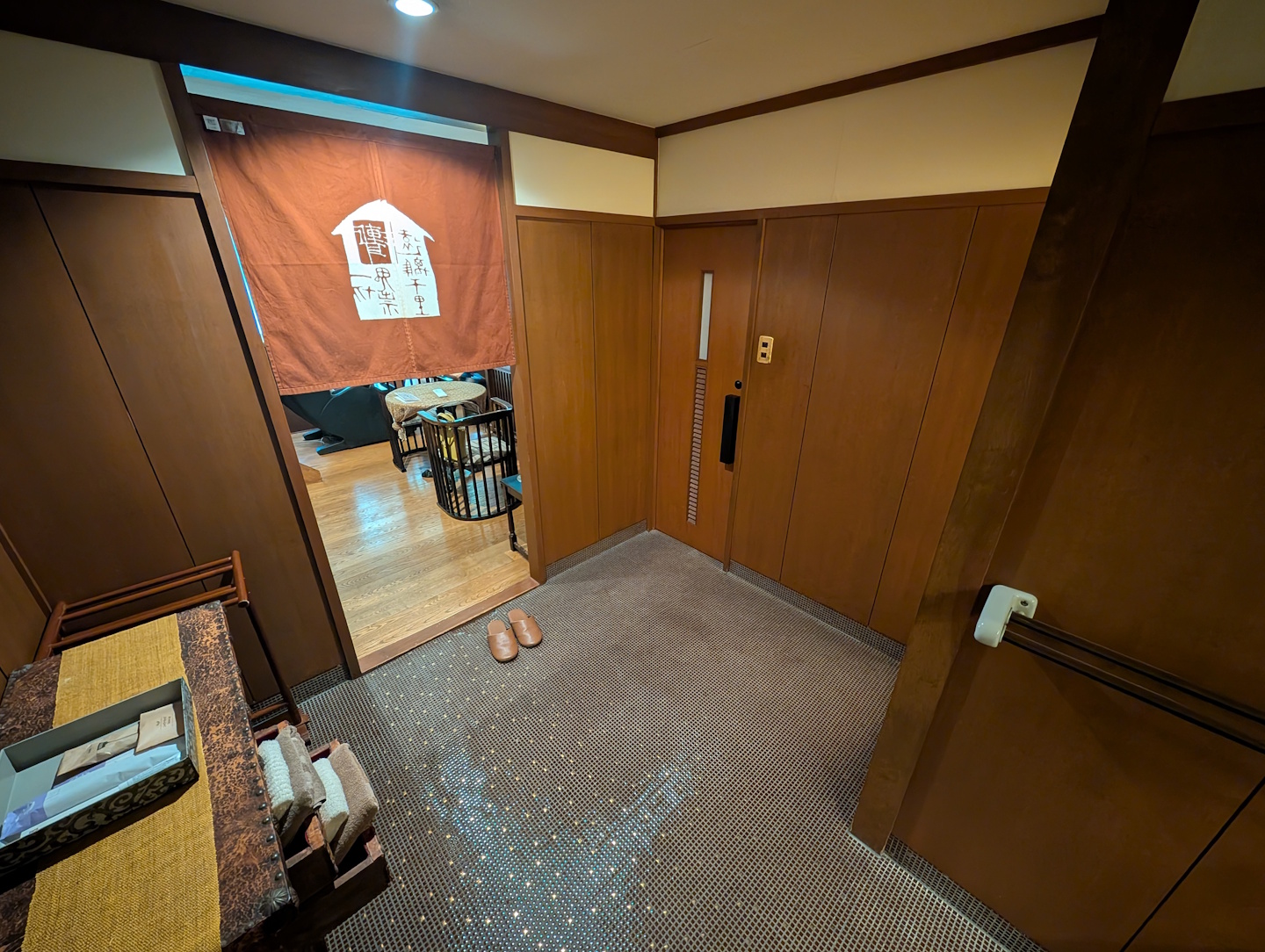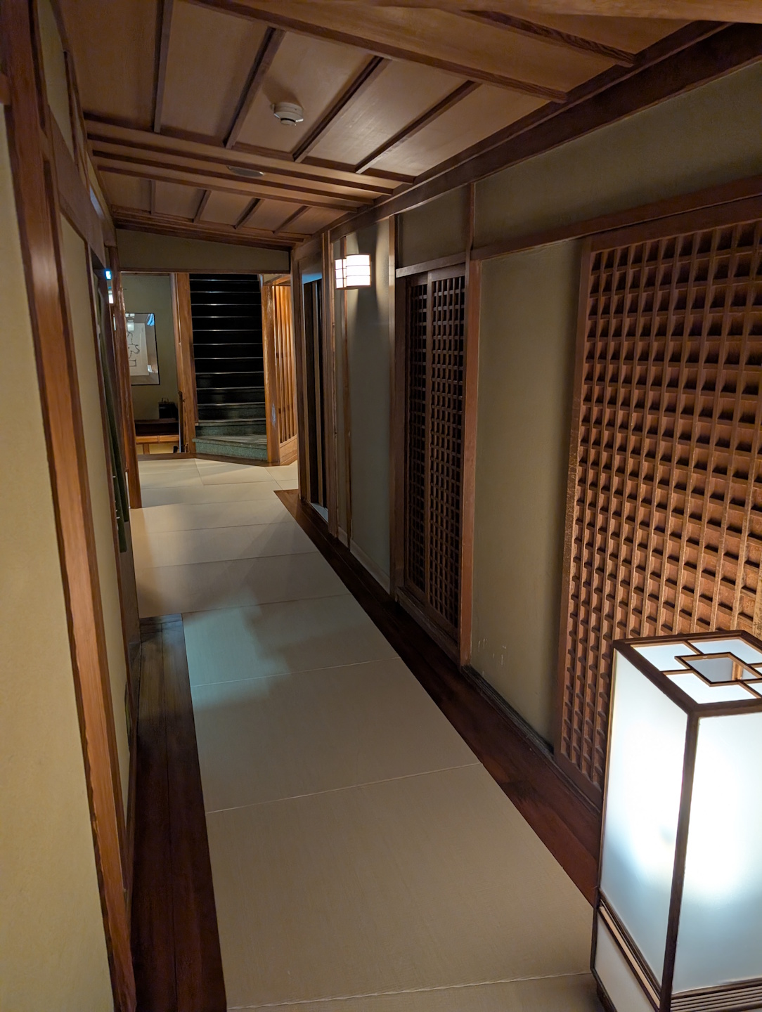 Nach Abschluss des Check In-Prozederes wurde uns zunächst unser Gepäck abgenommen und wir wurden gebeten, einer Mitarbeiterin zu folgen. Wie auch in japanischen Privatwohnungen ist es in Ryokans unbedingt üblich, nicht mit Straßenschuhen in die Wohnbereiche zu latschen; zu diesem Zwecke steht in der Lobby eine große Anzahl von Hausschlappen in allen möglichen Größen bereit, die man vor überschreiten der typischen Schwelle („Genkan“) anzieht. Die Straßenschuhe werden sodann an der Rezeption in Verwahrung genommen.