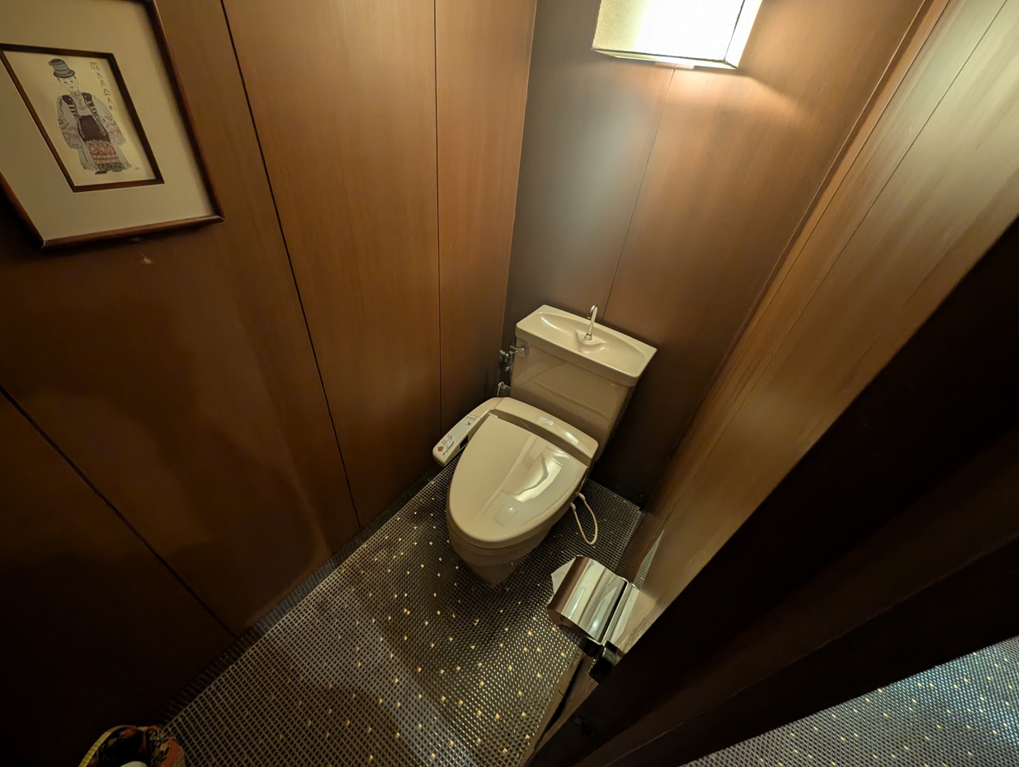 Ausgestattet war das Zimmer trotz seiner vergleichsweise ungewohnten Optik mit allen Annehmlichkeiten, die man auch von einem modernen westlichen Hotelzimmer erwarten kann: neben einem Telefon (in Bakelit-Retro-Optik) und jeweils einem Heiz- und Klimagerät pro Raum war auch das Badezimmer mit entsprechenden Kosmetika ausgestattet. Das hoteleigene WiFi war gut empfangbar (genutzt habe ich es dank eines internationalen Roaming-Plans aber nicht) und die Eingangstür zum Zimmer (ebenfalls Japan-typisch als Schiebetür ausgeführt) wurde durch einen vierstelligen Zahlencode aufgesperrt, der sinnvollerweise aus den vier letzten Ziffern der Mobilrufnummer des Zimmergasts bestand. Etwas schwierig zu bedienen waren hingegen die zwei Heiz- und Klimageräte, von denen sich je eines in jedem Raum befand – hierüber gibt es auch auf den öffentlichen Bewertungsplattformen einige Reklamationen. Zum Glück ließ das Wetter während unseres Aufenthalts es zu, weder heizen noch kühlen zu müssen.