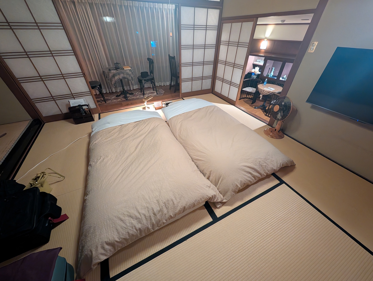 Wer sich bislang gefragt hat, wo in diesem Zimmer (oder vielleicht passender: der Suite) denn die Schlafgelegenheiten sind, wird im kommenden Absatz fündig. Nach Abschluss des Abendessens wurde der Tisch im Hauptraum durch das Personal zur Seite geschoben (am ersten Abend sogar komplett aus dem Zimmer entfernt) und zwei Futon-Schlafstätten dort platziert.