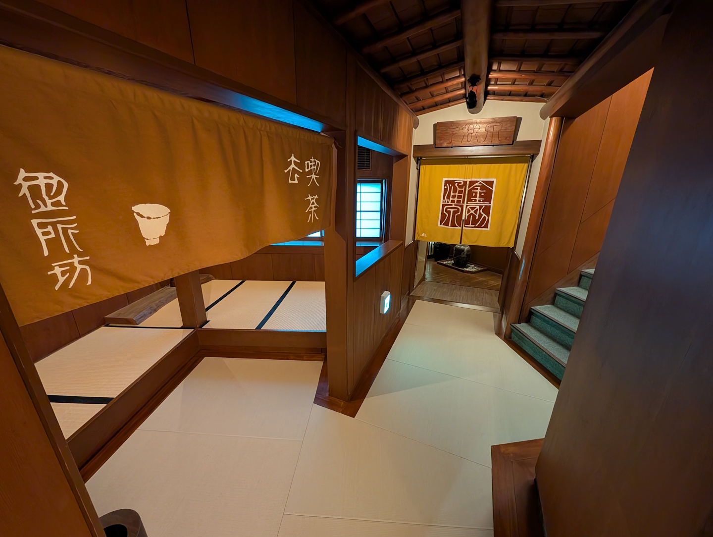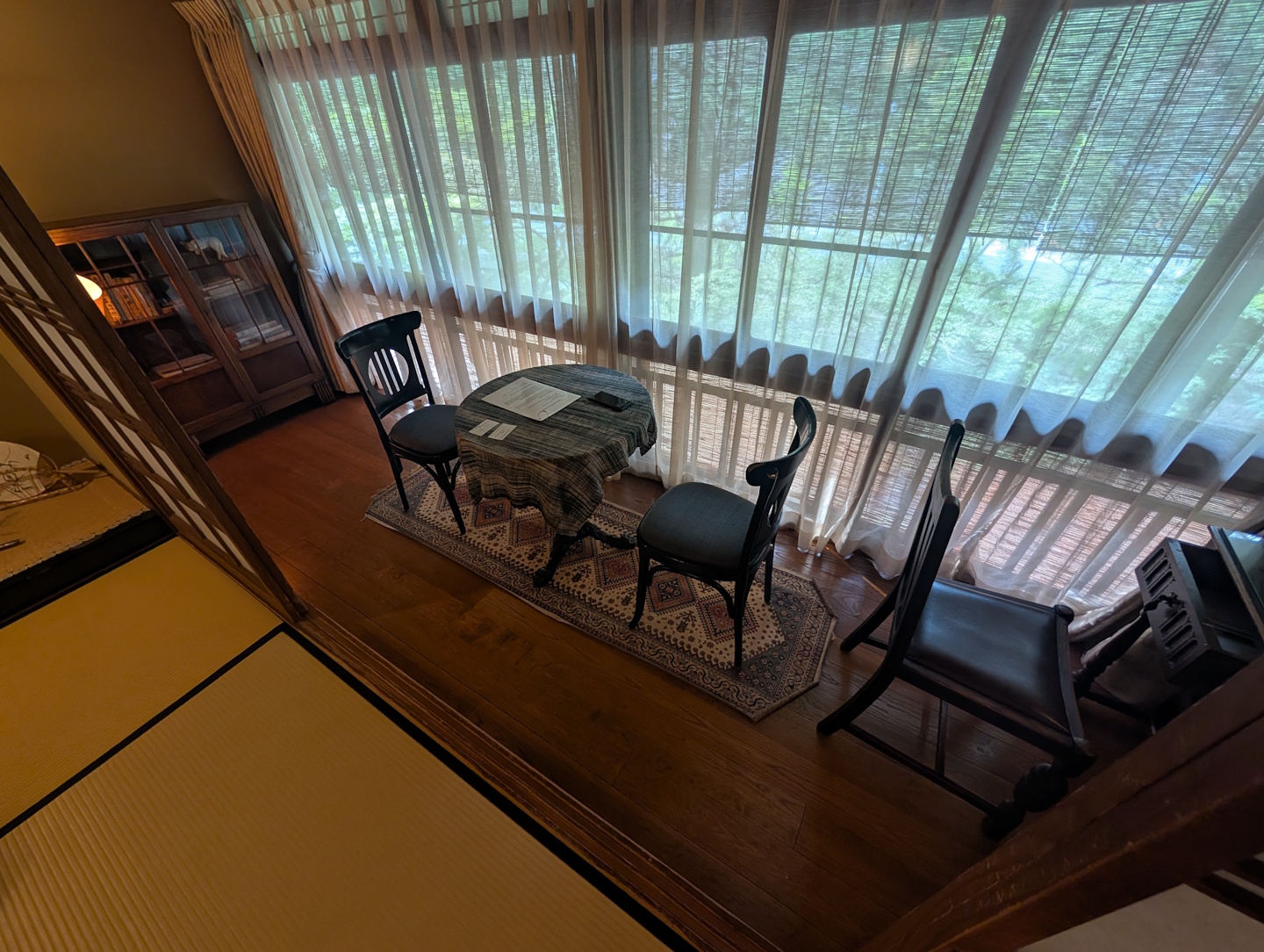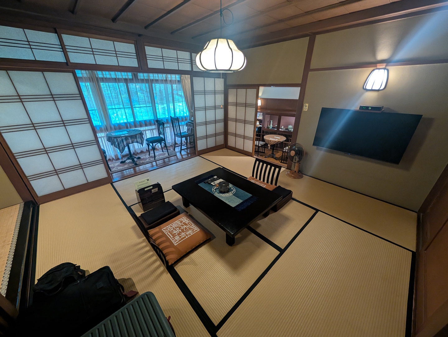 Das Zimmer, das nach internationalem Standard die Bezeichnung „Suite“ verdient gehabt hätte, bestand aus dem mit Tatami-Matten ausgelegten Hauptraum, der mit einem niedrigen Tisch ausgestattet als Speisezimmer und später, bei weggeräumtem Tisch und mit ausgelegten Futon-Matratzen auch als Schlafzimmer dient. Am Rande dieses Raumes befand sich ein mit zwei Stühlen, einem Bistrotisch und einem historischen Schreibtisch möblierter Erker, der auf den vorbeifließenden Bach und die Hauptstraße (auf der in der Nacht mehrfach einige sehr lautstark knatternde Mopeds unterwegs waren) blickte. Auch diese Raumausstattung ist in Ryokans durchaus die Regel.