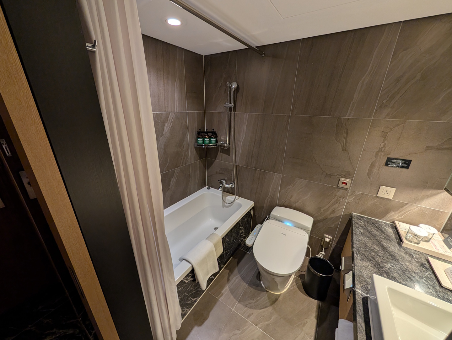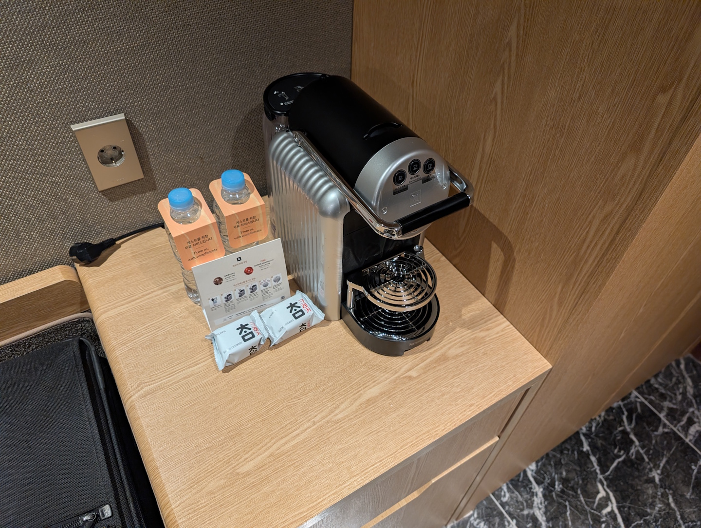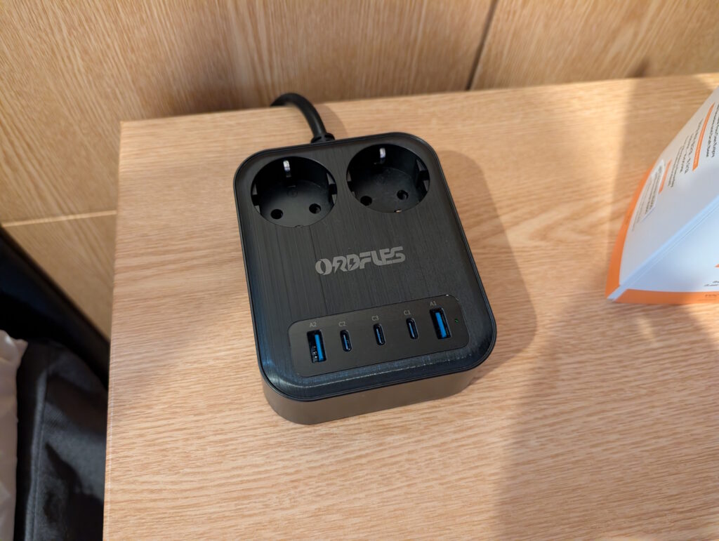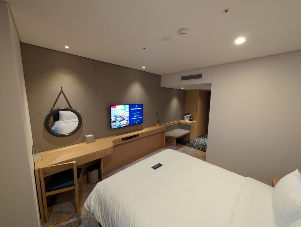 Bei der Steckdosen-Situation fühlte ich mich unangenehm an unseren Aufenthalt im Hyatt Regency Tokyo vom Sommer erinnert – auch hier waren diese Mangelware und am Bett nur auf einer Seite an einer Art Mehrfachsteckdose verfügbar. Immerhin muss man sich in Korea nicht mit Adaptern herumschlagen, da das gleiche Schutzkontakt-Steckersystem wie in Mitteleuropa (lassen wir die Schweiz einmal außen vor) Verwendung findet. Beachten sollte man jedoch die abweichende Netzfrequenz von 60 Hertz, die bei den meisten Elektrogeräte nicht zu Problemen führt, billige netzbetriebene Radiowecker aber vor gehen lässt.