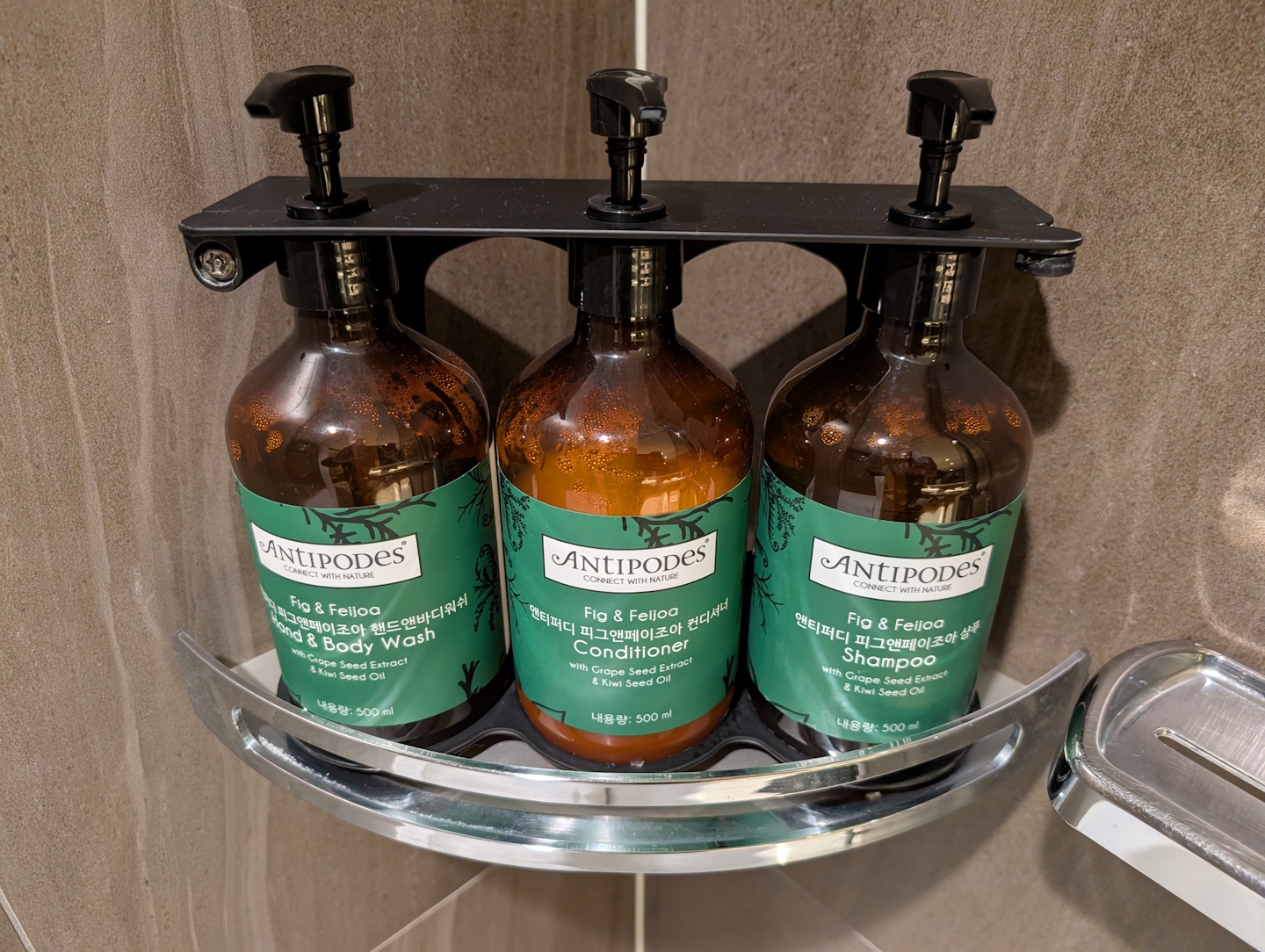 Im Badezimmer, das auch gerade groß genug war, dass man sich halbwegs bewegen konnte, kam hingegen wieder Crowne Plaza-Feeling auf. Die Duschkosmetika der Sorte „Fig & Feijoa“ der Marke Antipodes haben wir schon des öfteren dort angetroffen (was nichts daran ändert, dass ich den für meine Begriffe zu intensiven Geruch nicht mag und ihn irgendwie „billig“ finde).