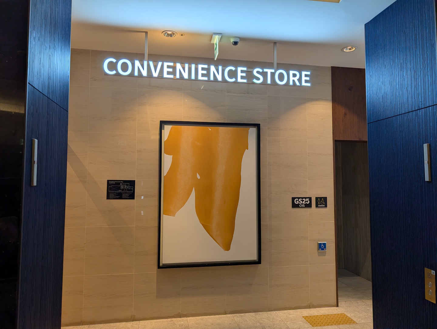 Ebenfalls in der Lobby, wenngleich ein wenig versteckt hinter den Aufzugsbänken, befindet sich ein kleiner Convenience-Store der Marke GS25 – unmittelbar neben dem Hotel gibt es aber auch entsprechende Angebote der Konkurrenz, beispielsweise 7eleven oder CU.