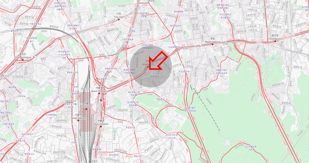 Was die unmittelbare Umgebung des Hotels angeht, liegt direkt auf der gegenüberliegenden Straßenseite der Eingang zum Namdaemun-Straßenmarkt, der tagsüber insbesondere von Senioren bevölkert wird. Neben dem Hotel (und sogar etwas versteckt in der Lobby-Ebene des Hotels) gibt es mehrere Convenience-Stores, in denen Getränke und Snacks erhältlich sind und auch einige lokale Restaurants befinden sich in der unmittelbaren Umgebung. Die Einkaufsstraßen und Malls im Zentrum von Myeongdong sind hierbei auch fußläufig in wenigen Minuten erreicht.