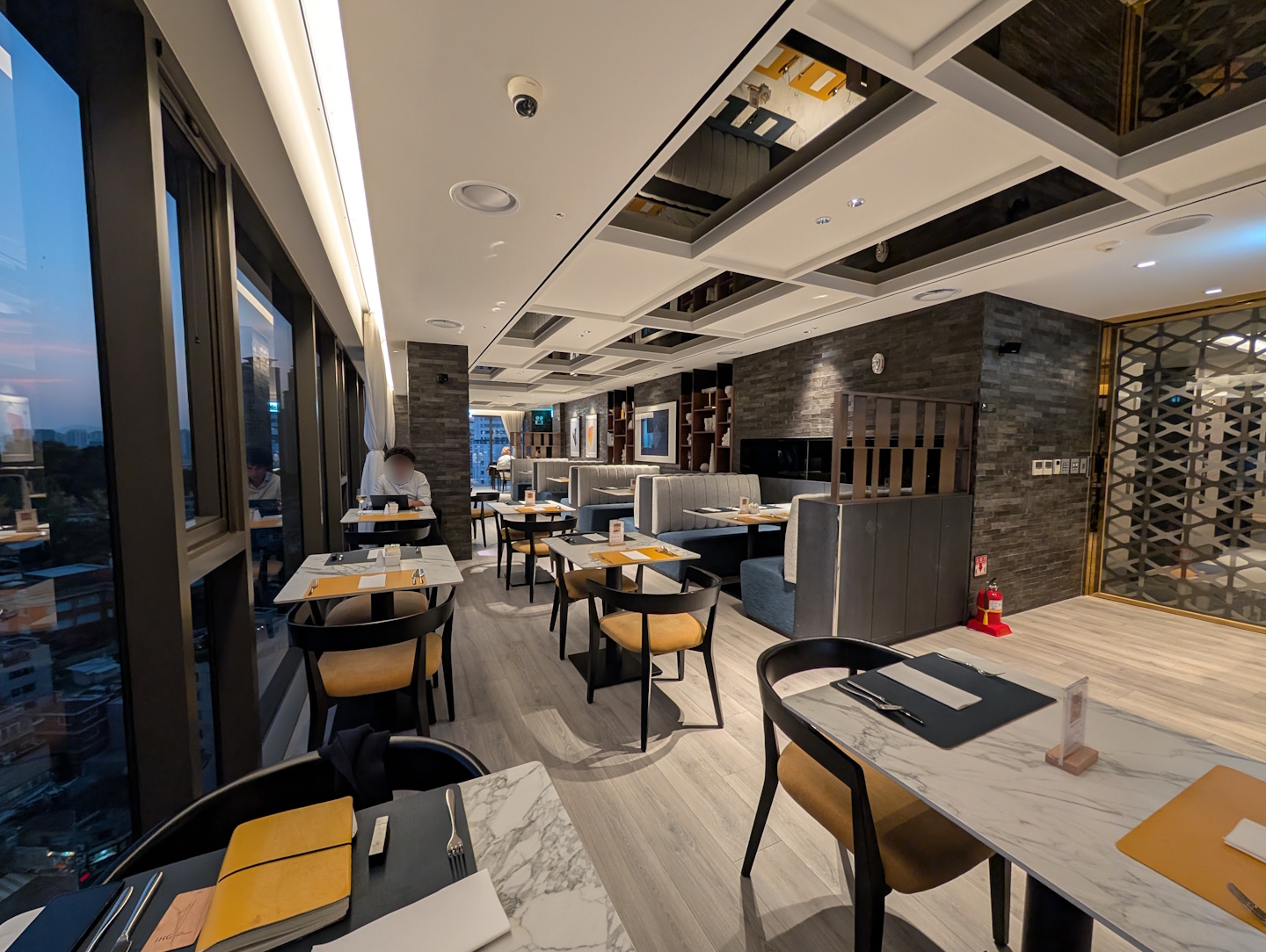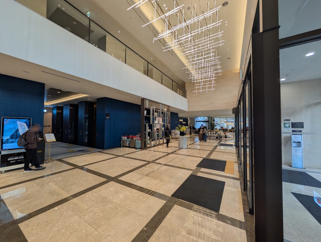 Betritt man das Hotel vom Haupteingang aus, findet man sich zunächst in der Lobby wieder. Hier befindet sich, recht unscheinbar hinter ein paar Sitzgelegenheiten am rechten Rand des Raumes, die Rezeption. In der Mitte neben den Aufzügen waren eigentlich durchgängig die durch die Gäste zur Verwahrung abgegebenen Koffer hinter einem Raumtrenner frei zugänglich aufgestapelt (hier hätte man sich, wenn man schnell genug gewesen wäre, vermutlich einfach so bedienen können). Rechts führt eine Rolltreppe auf die Galerie-Ebene mit dem Hotelrestaurant und einem Check-In-Bereich für Gruppen, der hauptsächlich von Flugbesatzungen genutzt wurde. Direkt von der Lobby aus zugänglich ist dazu eine Filiale der koreanischen Café-Kette „A Twosome Place“, ebenfalls im Erdgeschoss (aber nur von der Straße aus zugänglich) findet man einen Burger King.