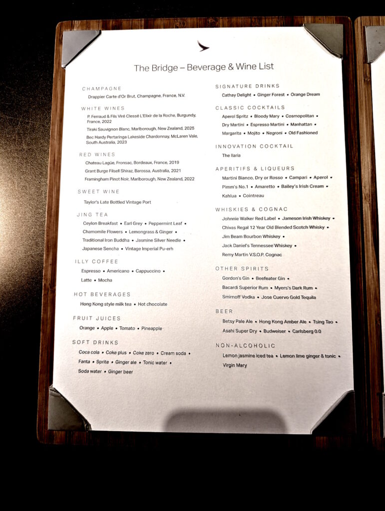 Die Getränke im rechten Lounge-Teil werden, mit Ausnahme von Heißgetränken, die auch an zwei Vollautomaten neben dem Buffet erhältlich sind, sämtliche Getränke nur an der bedienten Bar serviert. Diese verfügt über eine umfangreiche Barkarte, die im folgenden abgebildet ist (wobei es sich bei dem „Innovation Cocktail“ namens „Ilaria“ um einen profanen Limoncello Spritz handelte).