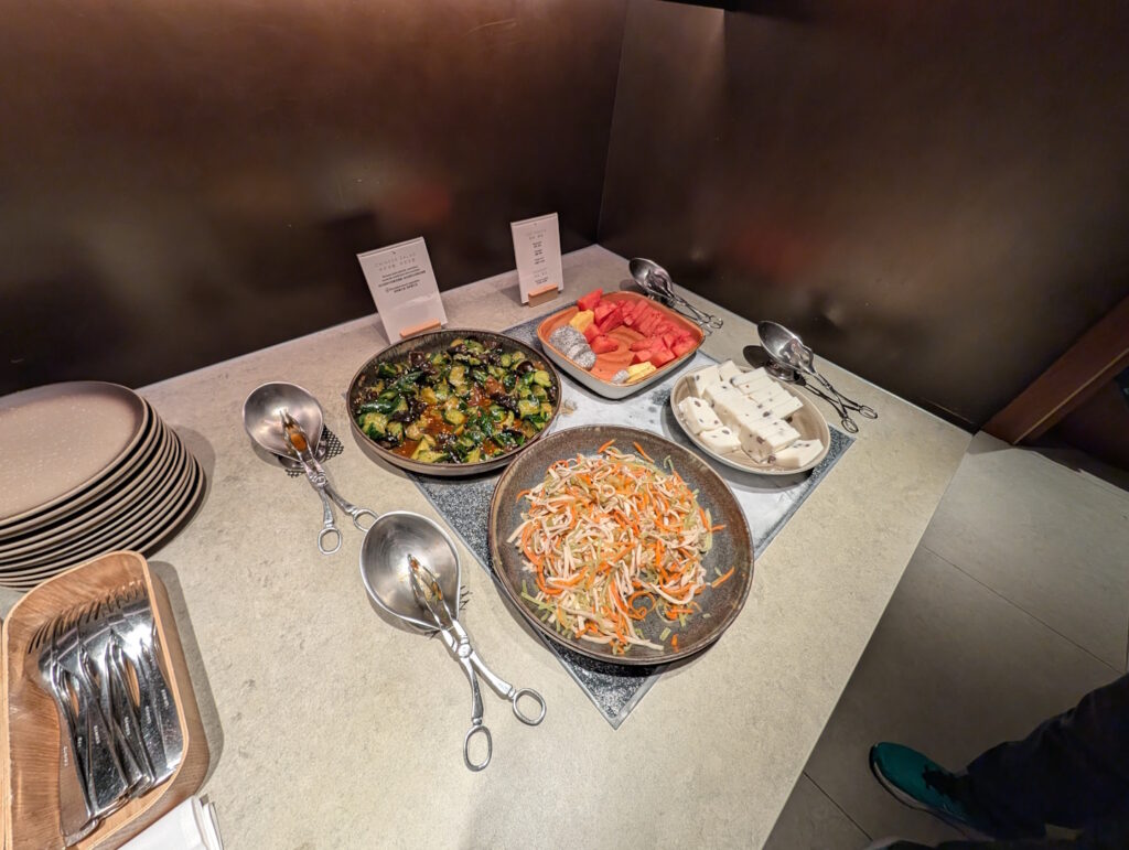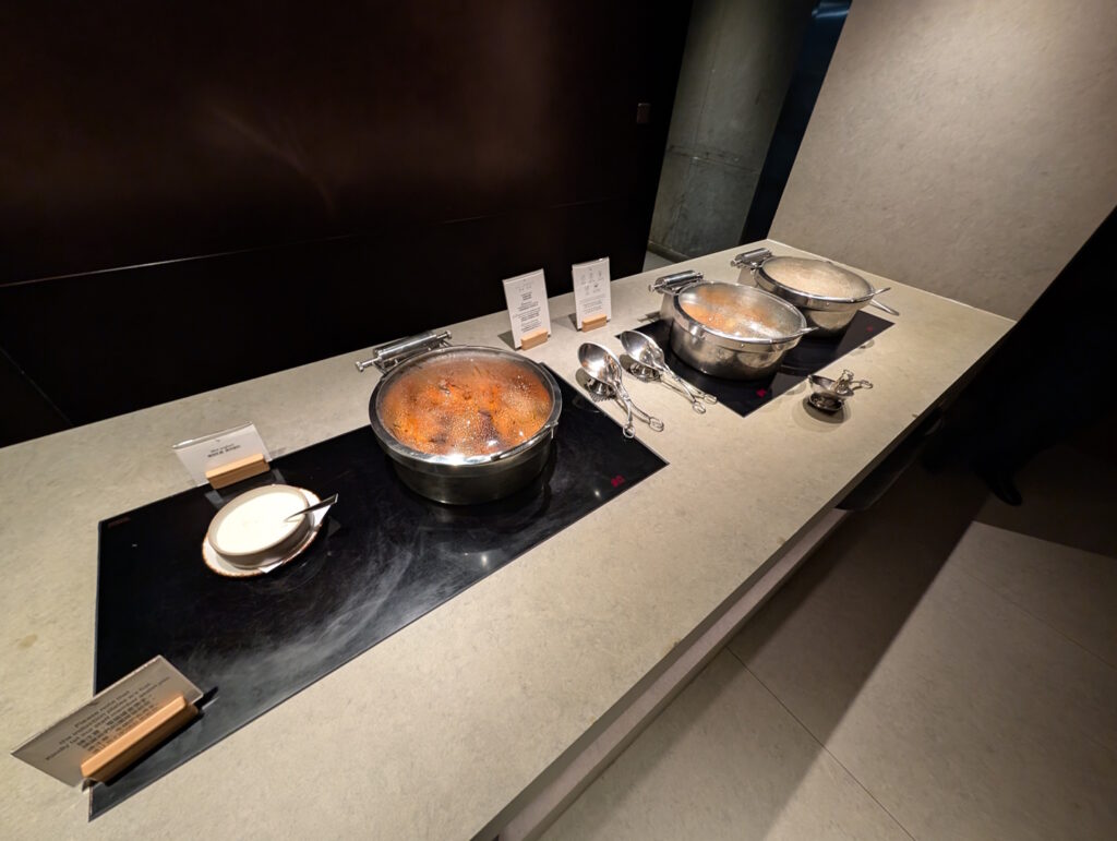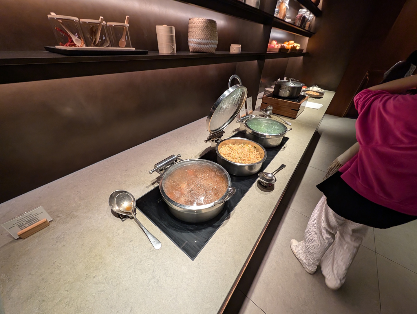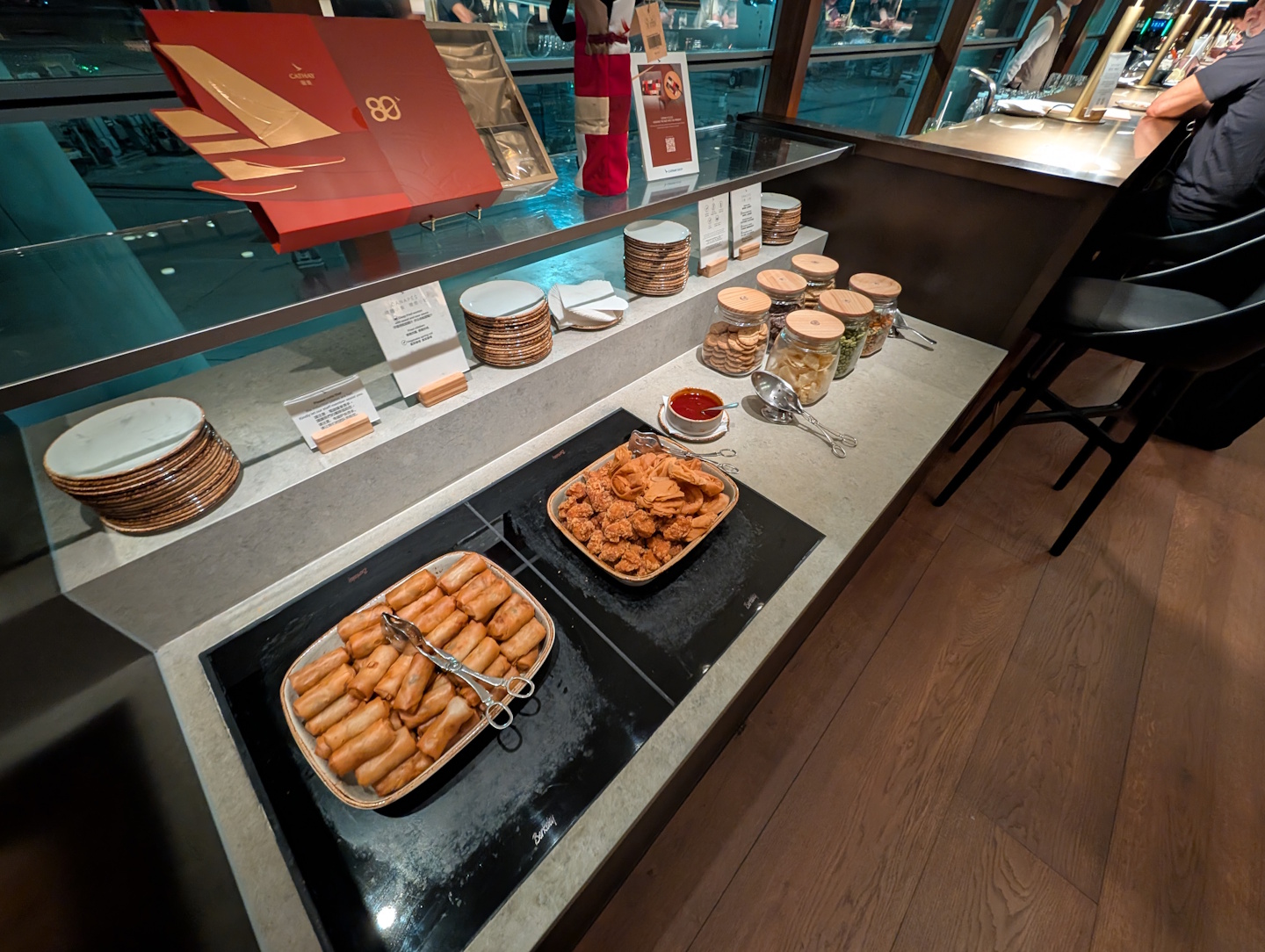 Hier gibt es auch noch einmal eine kleinere Version der Noodle Bar, unmittelbar davor stand auch ein kleiner Karren mit verschiedenen Weinen zur Selbstbedienung und zu regelmäßigen Zeiten (diese findet man auf einem entsprechenden Aufsteller) wird hier, ganz im Stile der Lufthansa Senator-Lounges unter Aufsicht eines Mitarbeiters, eine Auswahl von Dim Sum von einem Karren angeboten.