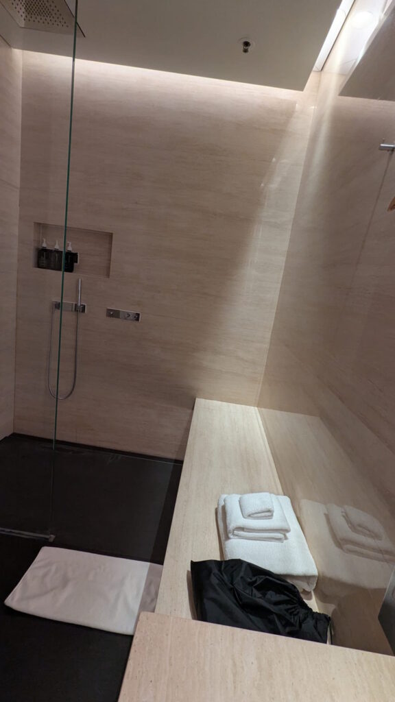 Am scheinbaren Ende des Lounge-Bereichs führt ein schmaler Durchgang zur Rezeption der Duschen, an denen bei unserem Besuch am Abend trotz der hohen Auslastung der Lounge keine Wartezeiten herrschten. Da ich nicht selber geduscht habe, war Madame so freundlich, zwei Bilder der insgesamt 5 oder 6 Duschkabinen zur Verfügung zu stellen.