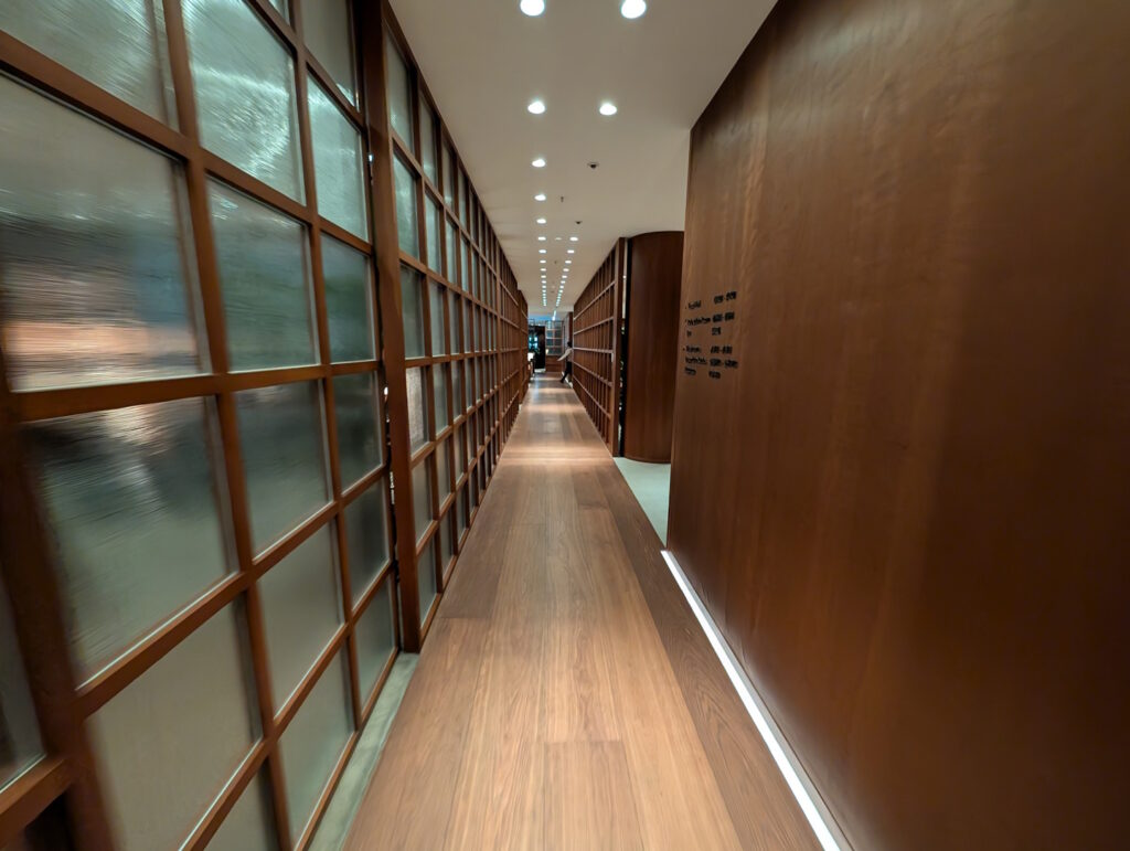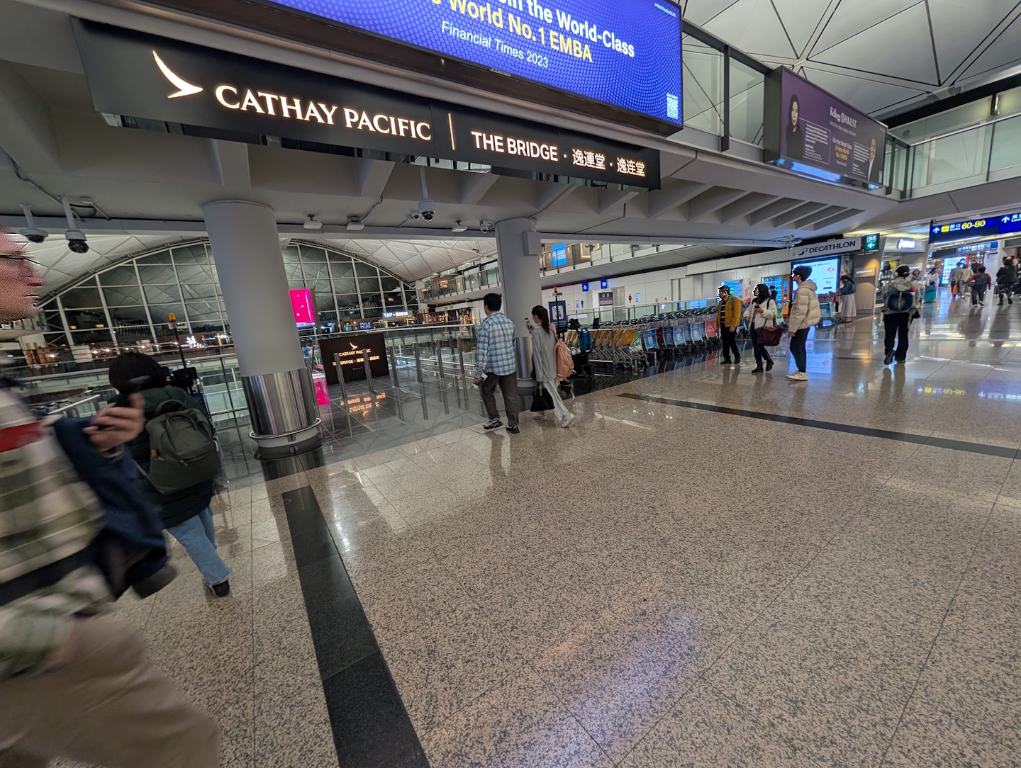 Die Lounge „The Bridge“ liegt strategisch sehr günstig im Hauptterminal genau an der Stelle, an der sich das Y-förmige Terminal in die zwei Ausleger verzweigt, zwischen den Gates 40 und 61. Damit ist sie die am zentralsten gelegene Lounge, die Cathay Pacific in Hongkong bietet, da eigentlich alle Gates innerhalb von 10 bis 15 Minuten fußläufig erreichbar sind. Auch deshalb handelt es sich bei dieser Lounge um die von mir bevorzugte, lediglich wenn man absehen kann, dass man ohnehin von einem der Gates 1 bis 11 abfliegt, wäre „The Wing“ die bessere Wahl, bei einem voraussichtlichen Abflug von den 60er- bis 70er-Gates könnte man alternativ auch „The Pier“ aufsuchen. Erreichen kann man die Gates von der Sicherheits- und Ausreisekontrolle natürlich zu Fuß, alternativ kann aber auch die unterirdische Kabinenbahn, deren mittlere Station direkt unterhalb der Lounge liegt, für einen Stopp genutzt werden.