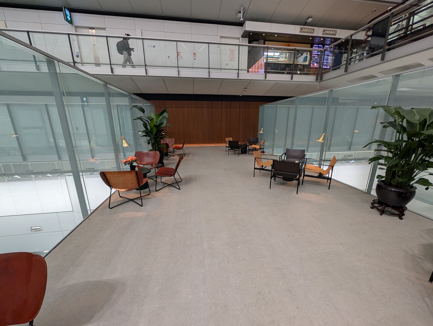 Von der Rezeption aus muss man zunächst entweder nach links oder nach rechts über die für die Lounge namensgebende „Brücke“ laufen, auf der sich bereits einige Sitzplätze befinden. Da diese aber gegenüber dem Terminal vollkommen unabgeschirmt sind, ist es hier hell, laut und unruhig, weshalb dies wohl die unbeliebtesten Plätze der ganzen Lounge sind.