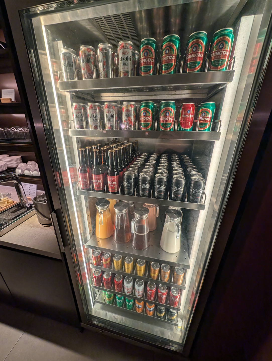 Getränketechnisch ist man im linken Lounge-Teil recht eingeschränkt, da es hier lediglich Bier und Soft Drinks aus einem Kühlschrank (leider nicht ausreichend kalt) gibt – zusätzlich fanden wir, ebenfalls wieder gut versteckt, im Bereich „The Nook“ unmittelbar vor der dortigen Nudelbar einen Karren mit verschiedenen Weiß-, Rot- und Schaumweinsorten.