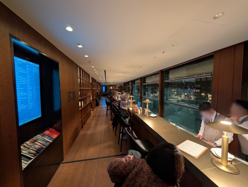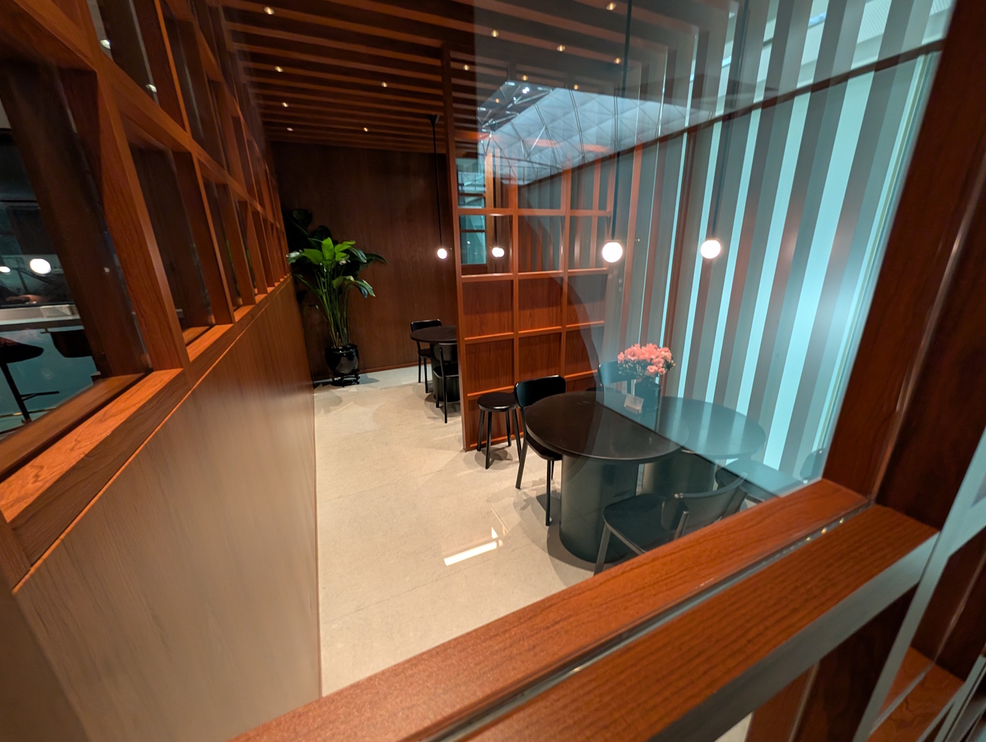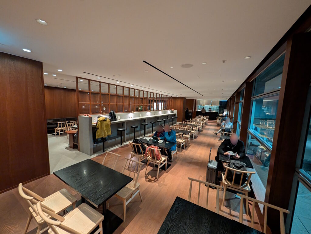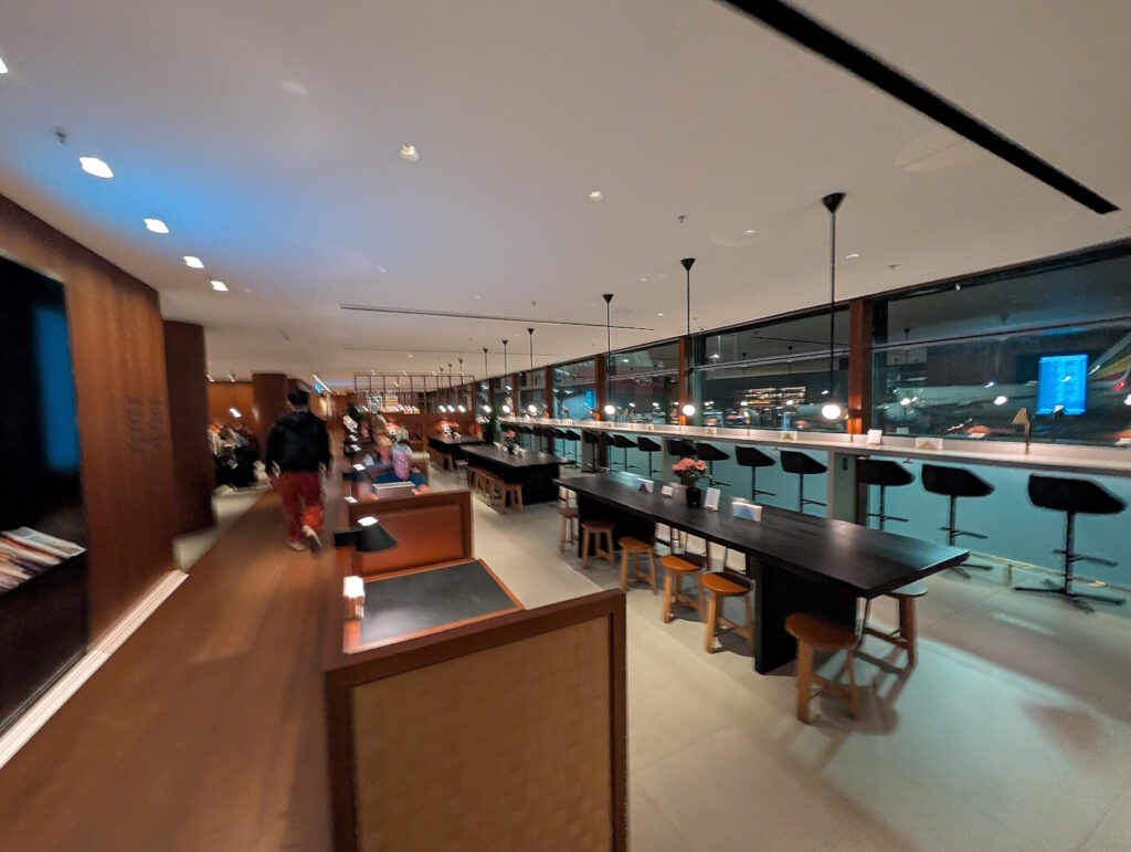 Der rechte Teil der Lounge, der ein internationales Angebot bietet, war bei unserem Besuch erstaunlicherweise nicht so voll wie ursprünglich erwartet. Betritt man diesen Bereich, findet man auf der Fensterseite zunächst einige mit opaken Glaswänden abgetrennte Sitzplatzbereiche, die speziell für Oneworld Emerald-Statuskunden vorgesehen sind.