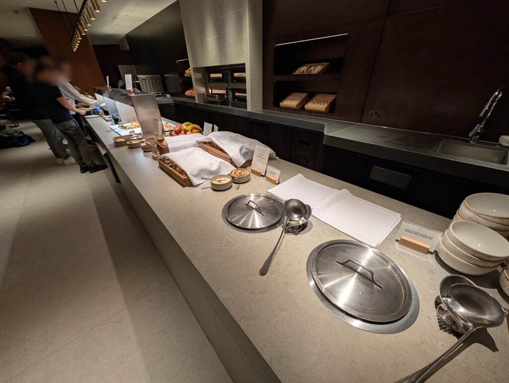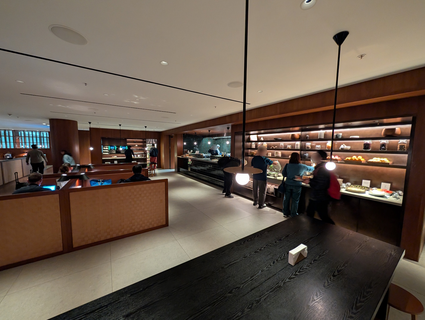 Diesem gegenüber liegt auf der Gebäudeinnenseite die für Cathay Pacific Lounges charakteristische „Noodle Bar“, die im Zuge der Lounge-Renovierung in dieser Lounge neu eingeführt wurde. Hier können Speisen à la Carte bestellt werden, darüber hinaus findet man eine kleine Buffet-Auswahl mit asiatischen Kleinigkeiten.