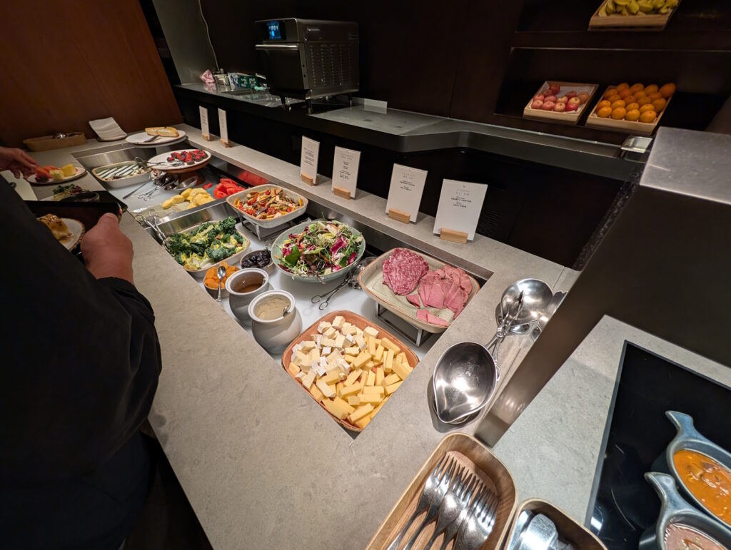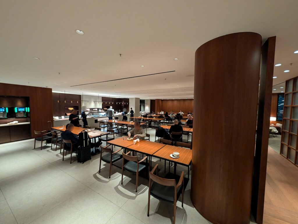 Der rechte Lounge-Teil bietet mit seiner großen bedienten Bar und einem umfangreichen internationalen Buffet die größere Auswahl an Speisen und Getränken, verzichtet dabei aber auf das Anbieten frisch auf Bestellung zubereiteter Gerichte.