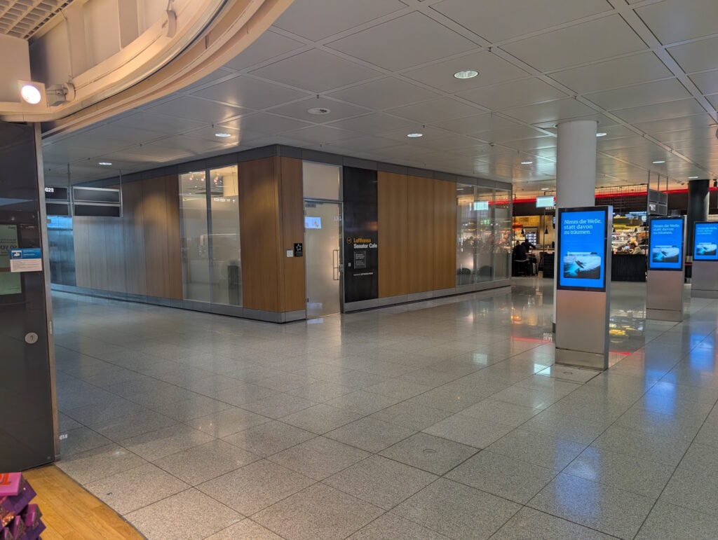 Das Senator Café liegt mehr oder weniger direkt gegenüber der Senator Lounge G28 neben dem Duty Free-Shop in Richtung der hohen G-Gates und unmittelbar vor den Abgängen zur Kabinenbahn, die zum Satellitenterminal führt. Ein eher unscheinbarer Eingang, der vom Stil her an die Eingänge zu den Lufthansa First Class Lounges erinnert, führt zunächst zu einer kleinen Rezeption.