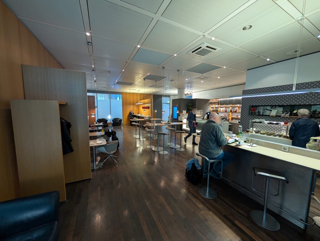 Die extrem kleine Lounge, die primär als Überlauf für die mitunter recht vollen Senator Lounges G24 und G28 konzipiert wurde, besteht nur aus einem einzigen Raum mit ca. 32 Sitzplätzen, die sich überwiegend an hohen Gemeinschaftstischen (davon einer mit einer Steckdosenleiste in der Mitte) befinden. Die wenigen Sessel entsprachen bei unserem Besuch noch dem alten, nicht erneuerten Standard der Senator Lounges, die übrigen Sitzgelegenheiten befinden sich an 4 Bistrotischen für je 2 Personen.