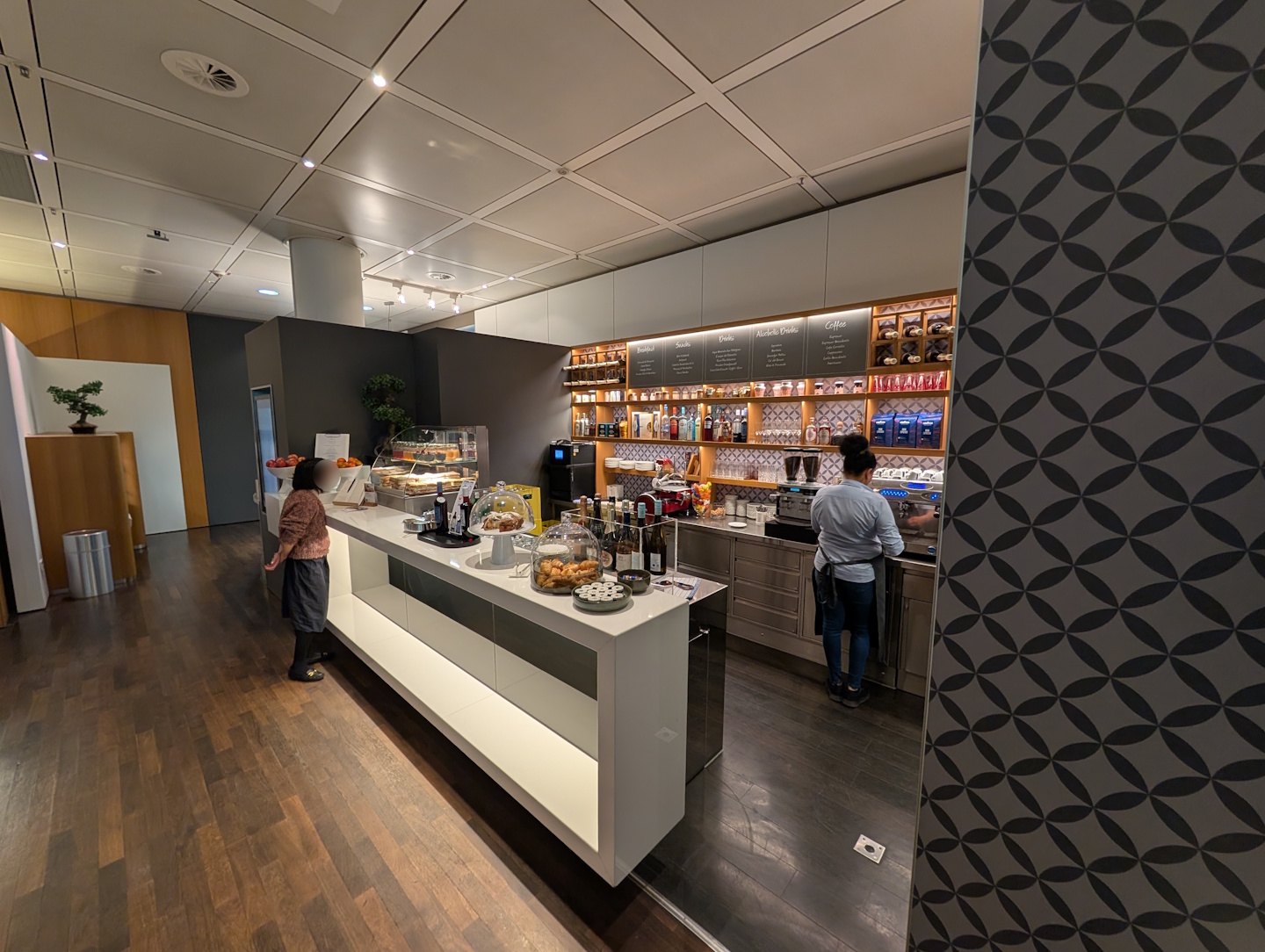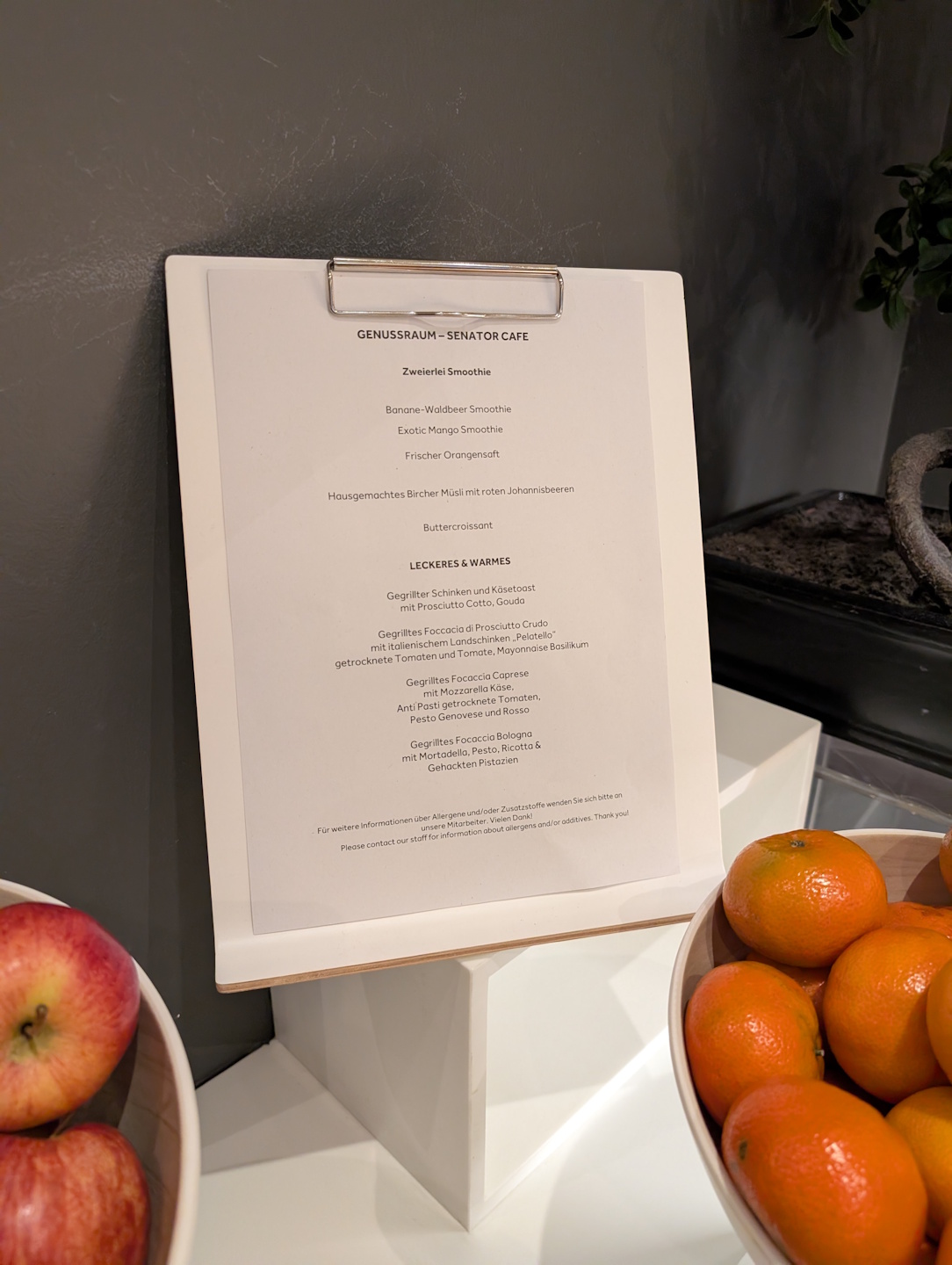 Im Senator Café findet man hinter dem Eingang eine kleine, bediente Barista-Bar, an der neben diversen typischen Getränken (u.a. Aperol Spritz etc.) auch eine Auswahl von Panini und dergleichen erhältlich ist. Auf Wunsch werden diese auch frisch aufgewärmt. Dazu gibt es selbstverständlich auch frisch auf Bestellung gebrühten Kaffee, während der Service sehr freundlich und engagiert verläuft.