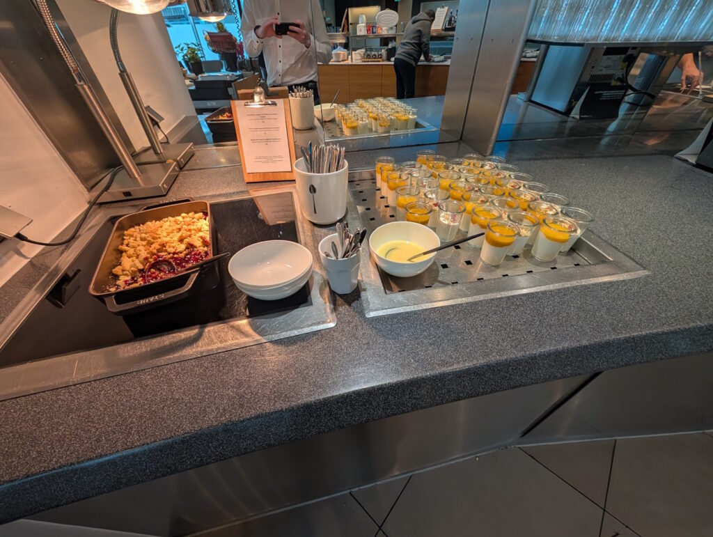 Zusätzlich gab es, wie in Senator-Lounges seit einiger Zeit üblich, ein Spezialgericht, das direkt an einem separaten Counter frisch angerichtet wurde. Dieses war gegen 13 Uhr dann aber vergriffen.