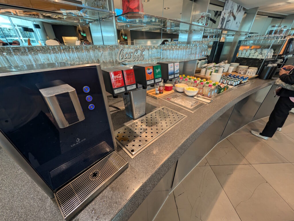 Ich muss sagen, dass mich das Speisenangebot nicht wirklich angesprochen hat; gerade angesichts der Tatsache, dass es sich hier um eine Non-Schengen-Lounge handelt, deren Besucher in der Regel lange Flüge vor- oder hinter sich haben und die ggf. eine Mahlzeit im Flugzeug nachholen oder vorwegnehmen möchten, hätte die Auswahl durchaus für meine Begriffe ein wenig umfangeicher sein dürfen.