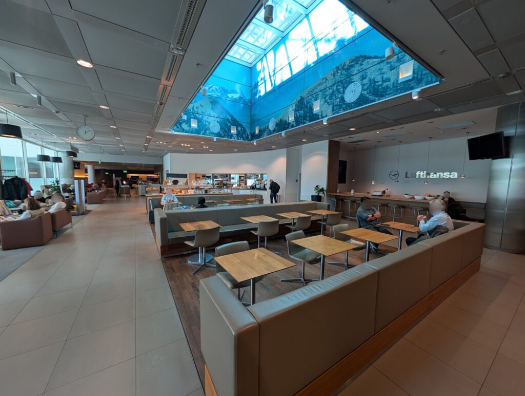 Die Lounge selber besteht aus zwei Bereichen. Tritt man von der Rezeption her ein, findet man sich zunächst im lichtdurchfluteten Bistrobereich der Lounge wieder, der nicht nur durch ein Oberlicht (ähnlich der Business Class-Lounge im Abflugbereich G) Tageslicht erhält, sondern durch große, bodentiefe Fenster auf die Sicherheitskontrolle und die beeindruckende Stahlkonstruktion der Halle, gebaut vom Münchner Stahlbau-Unternehmen Maurer Söhne, das vielen eher als Hersteller von Achterbahnen ein Begriff ist, blickt.