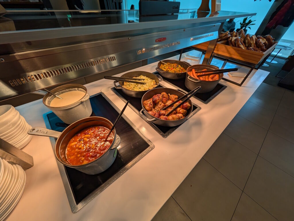Speisentechnisch wurde die von einer Lufthansa Senator-Lounge erwartbare Auswahl an kalten und warmen Speisen geboten, will meinen, eine Auswahl an Salat und eine kleine Auswahl warmer Gerichte vom Buffet. Vermisst habe ich hier dieses mal jedoch eine lokale Option (sonst war ich es gewöhnt, dass eigentlich immer mindestens ein Leberkas erhältlich war), wenn man einmal von der Auswahl an Brezeln absieht.