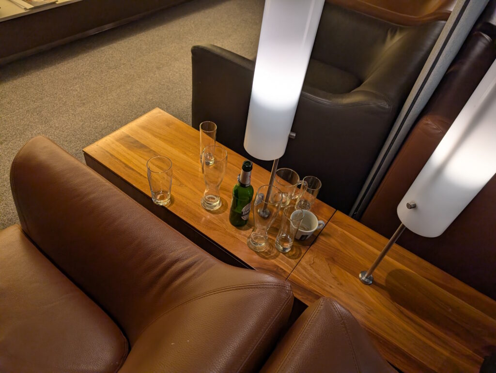 Ich bin grundsätzlich kein Fan bedienter Bars in Flughafen-Lounges, da ich gerne ein wenig experimentiere und neue Optionen ausprobiere – das ist an ebenjenen Bars, an denen man immer auf die Mithilfe des Personals angewiesen ist, aber immer ein wenig schwierig. So ist das Personal in aller Regel nicht wirklich geschult, kennt sich mit dem Sortiment kaum aus (Barkarten gibt es in der Regel, so auch hier, nicht) und ist häufig auch gar nicht anzutreffen. Genau das war auch hier das Problem, wenngleich ich sagen muss, dass die Auswahl an Spirituosen hinter der Bar ein wenig über die übliche Senator-Auswahl hinaus ging (das Sortiment an Patron-Tequila kannte ich so z.B. noch nicht, darunter offenbar auch eine Sorte, die im Handel knapp 200 Euro kostet).