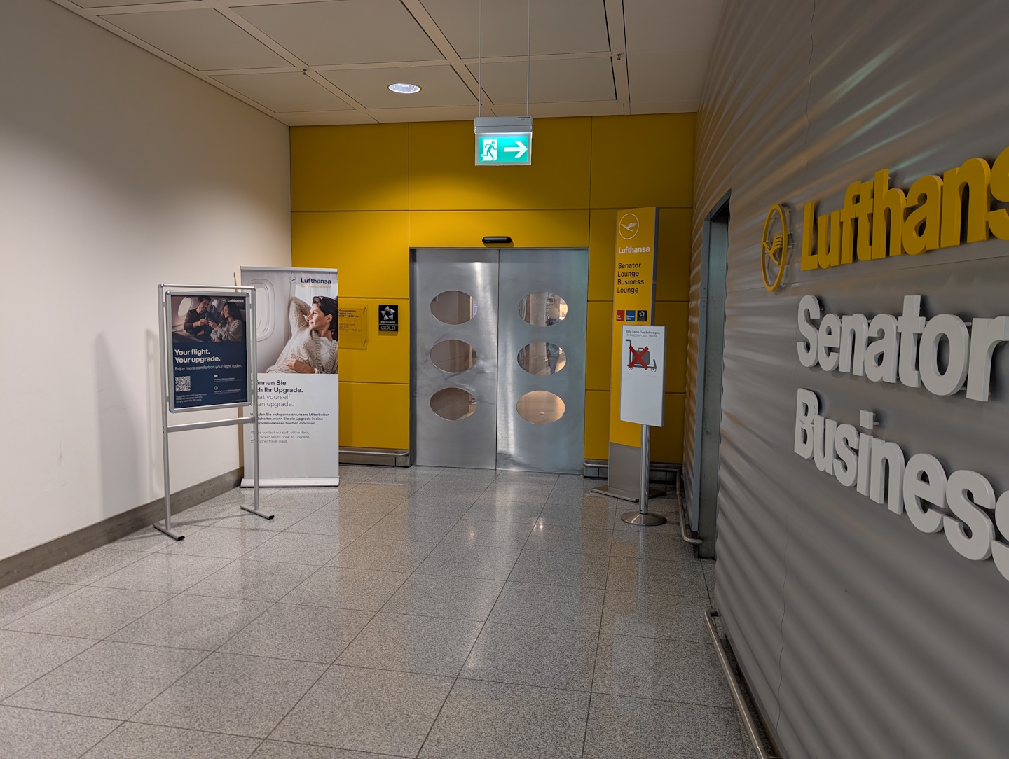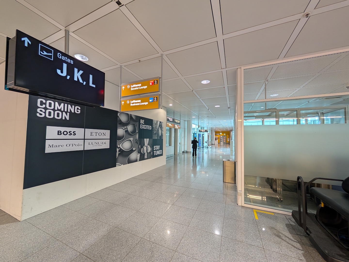 Der Zugang zur Lounge liegt etwas versteckt linker Hand der Passkontrolle, die man vom Concourse G oder der Sicherheitskontrolle im Terminal 2 aus erreicht, direkt gegenüber der Lufthansa First Class Lounge und in etwa auf Höhe der Gates H22 und H23. Hier führt ein unscheinbarer Korridor (wir sind bei unserem ersten Versuch gleich mal dran vorbeigelaufen) zu einer automatischen Schiebetür, die zur kombinierten Rezeption der Business Class- und Senator-Lounges führt.