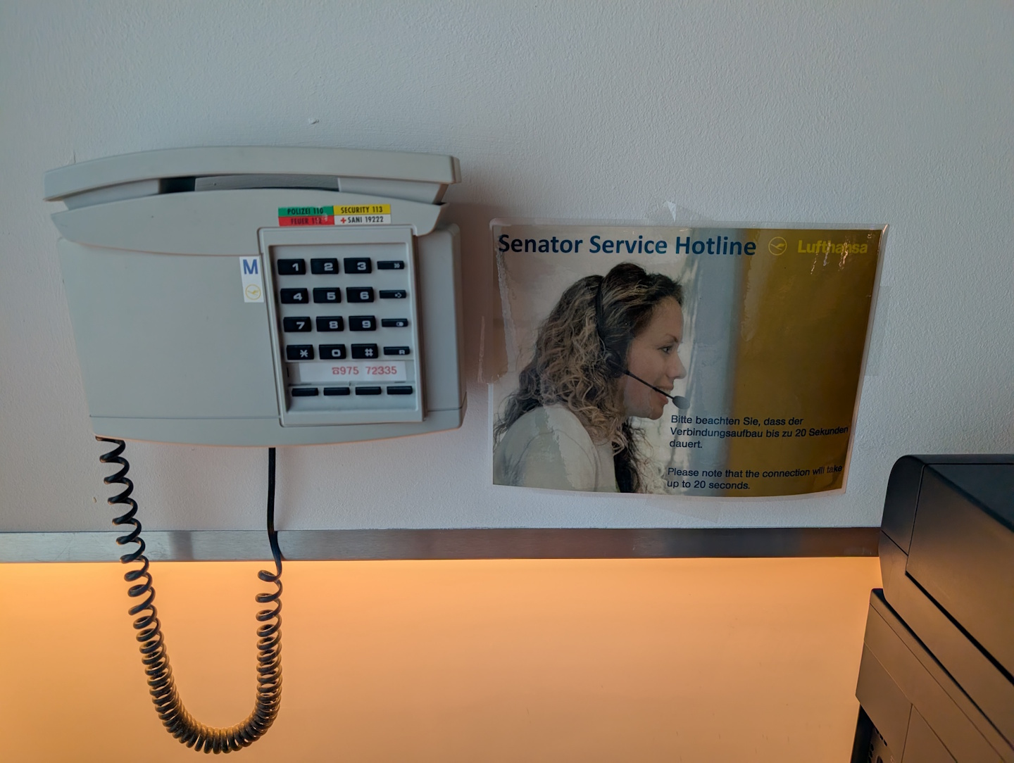 An der Rezeption, ebenfalls wieder geteilt mit der Business Class Lounge, existieren dazu noch zwei Telefonkabinen, die aber kaum genutzt wurden – stattdessen sprach man lieber in der Lounge mit Lautsprecher-Funktion, was dem ganzen eine unruhige Atmosphäre verlieh (überhaupt ist die Akustik hier nicht besonders gut).